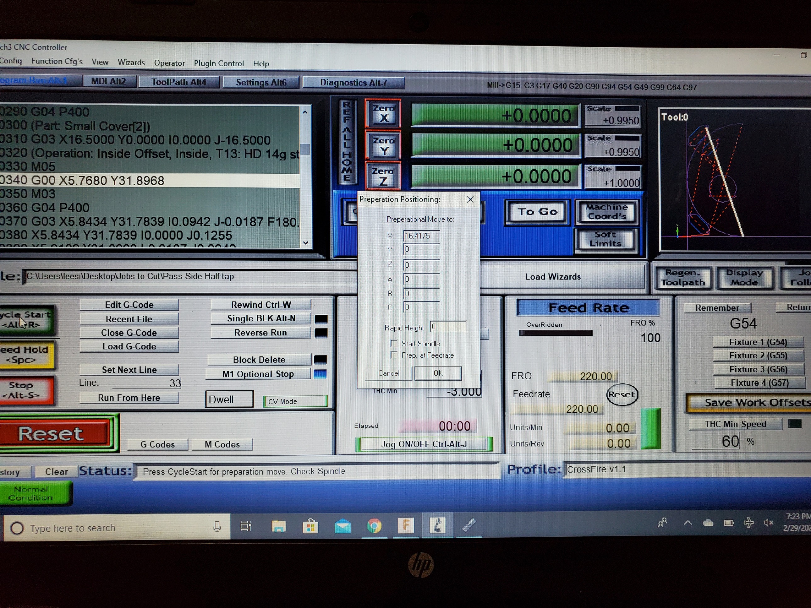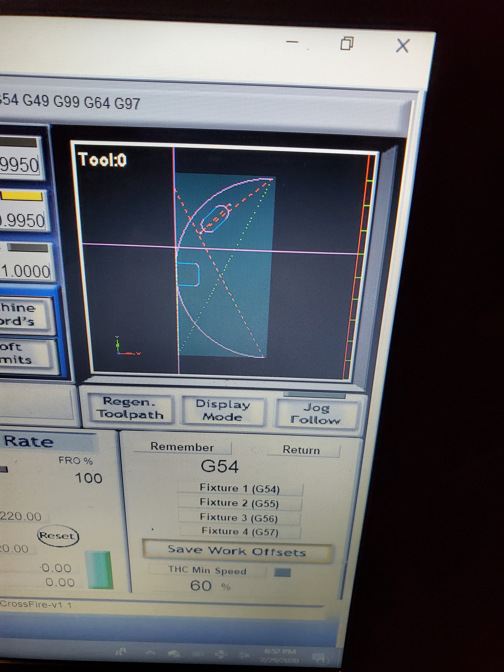 I didn’t grab pictures of Sheetcam but there are only a couple things you need to do differently when generating the cut paths. When importing the drawing, select “offset open contours.” Generate cut paths for the normal, complete contours (my complete circles and ovals) on their own layer. When generating a cut path for the open contour (the incomplete, half circle in my case) add it to it’s own new layer and select no lead in/out and outside offset. For the second half, you’re going to need to use the rotate function in the bottom right hand corner and rotate the second image 180 degrees if it’s a circle like mine. If you’re simply sliding your work pieces down the Y axis and not rotating it, do not rotate it in Sheetcam. You should have two G-code files now, one for each half.
