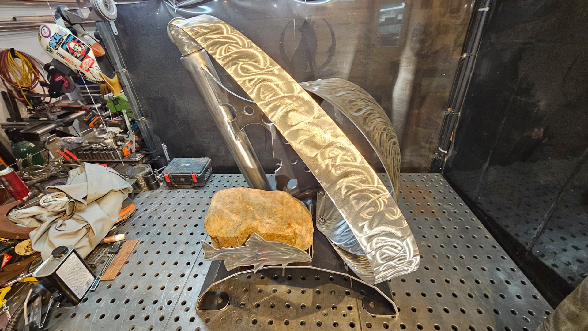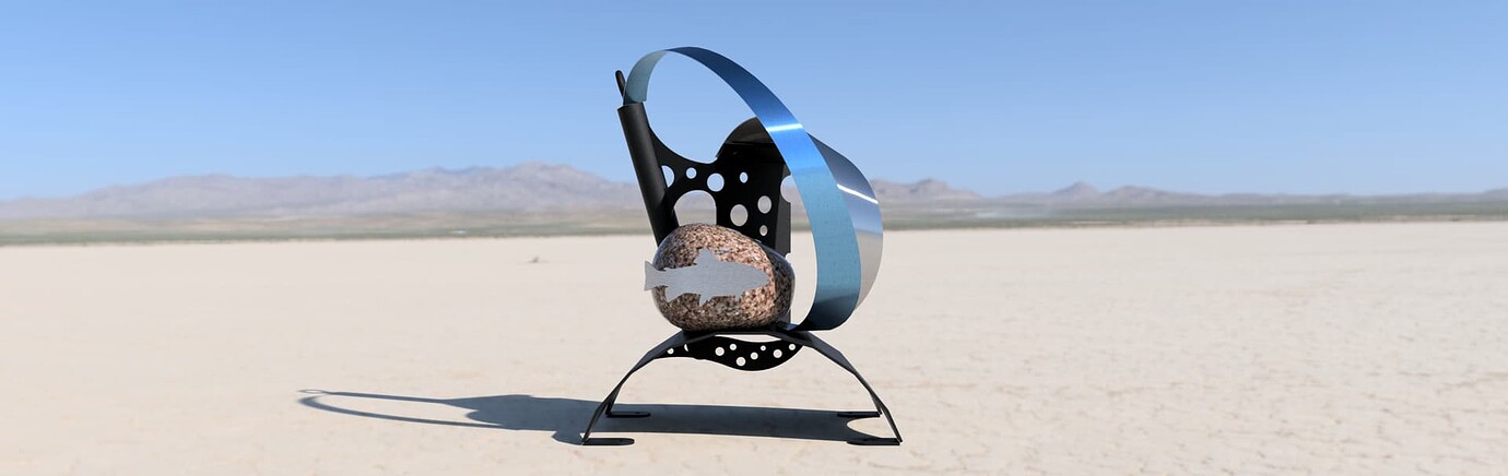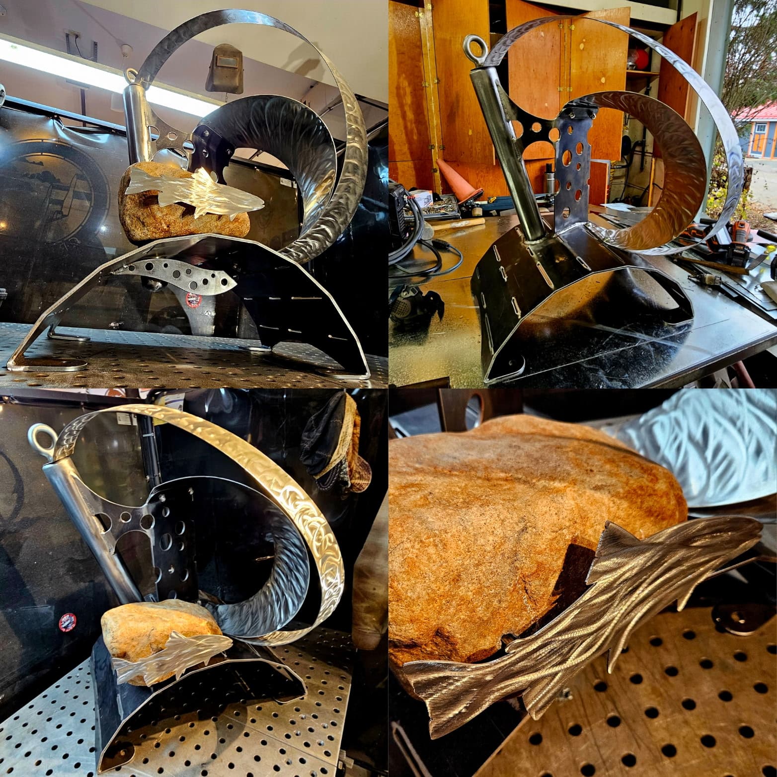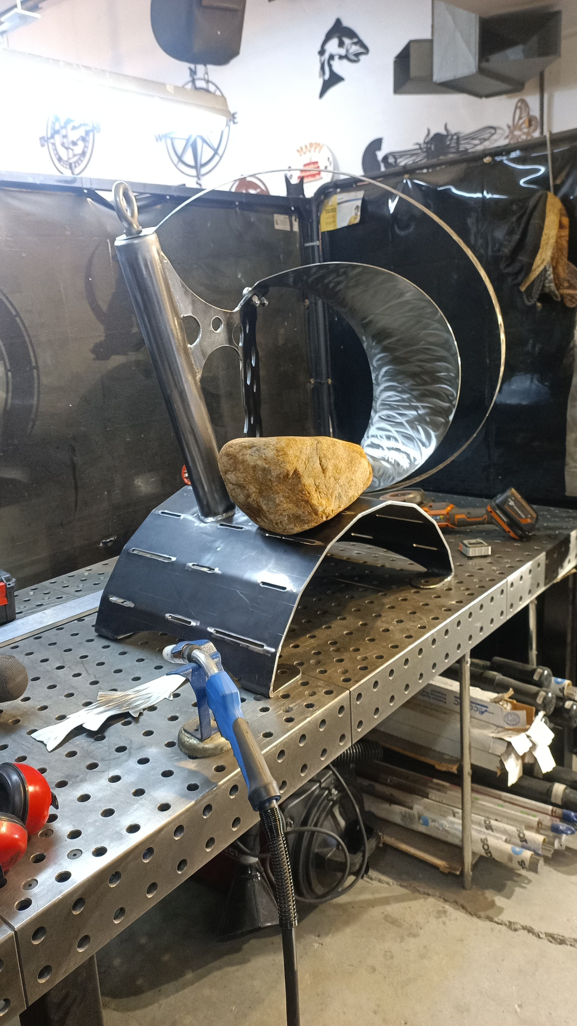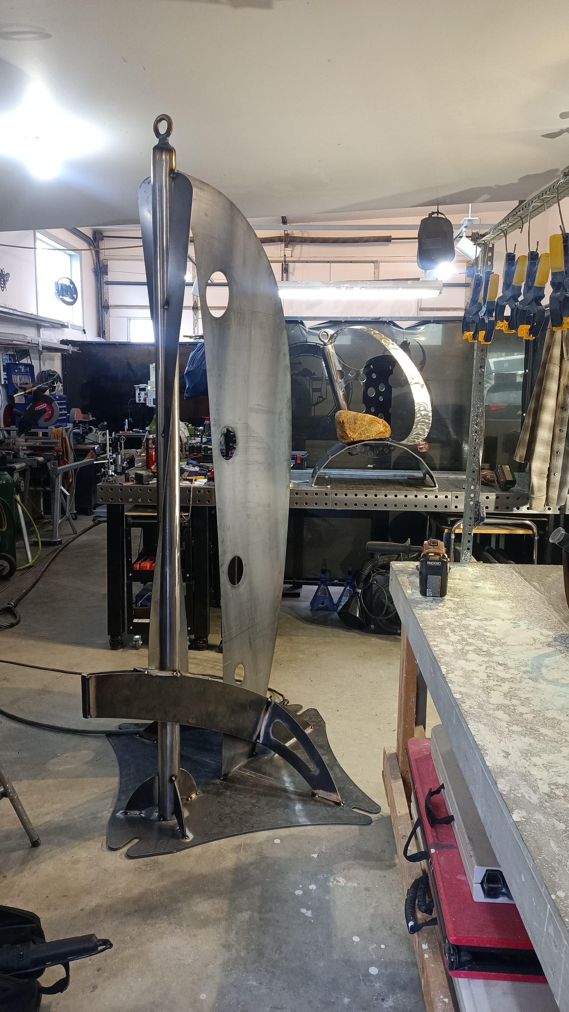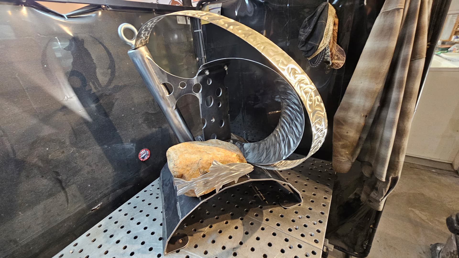 Shapeshift is ready for textured black powder coating. And one of the stainless hoops is going to get heat treated to Blue. The rock also needs to be acrylic sealed