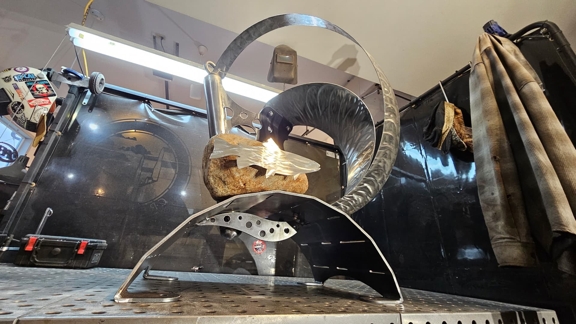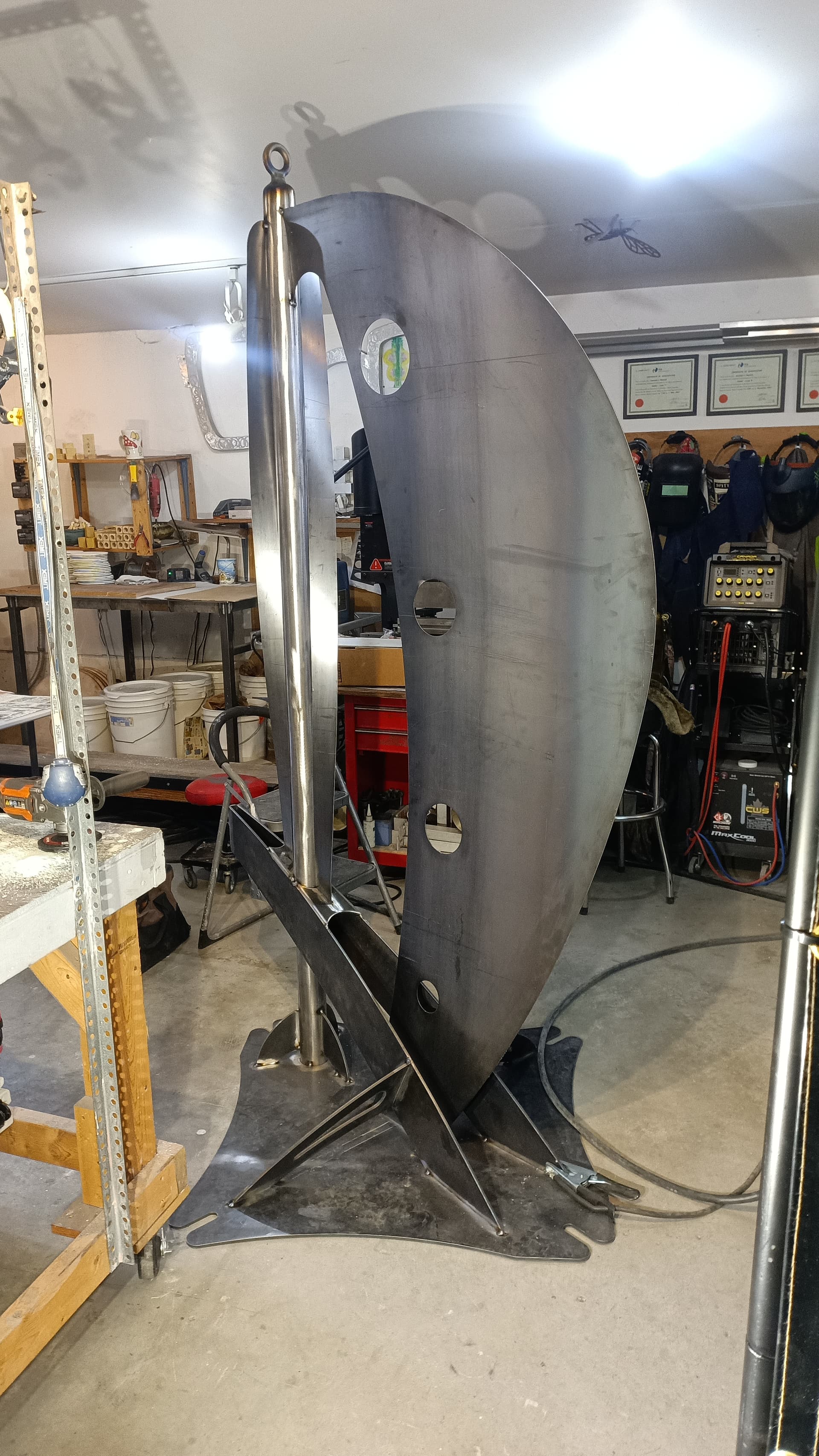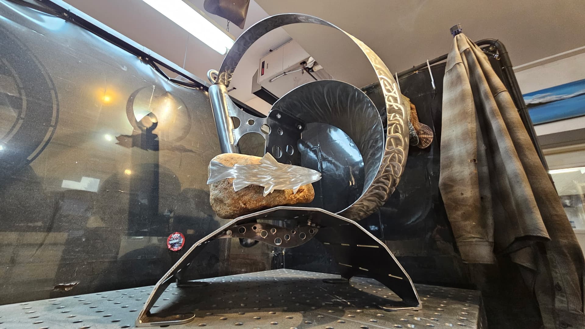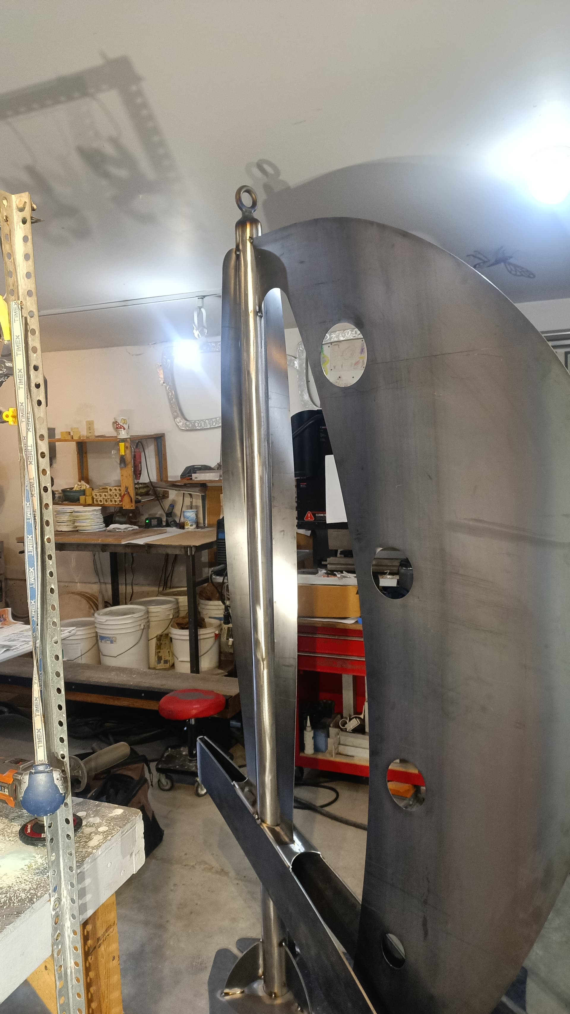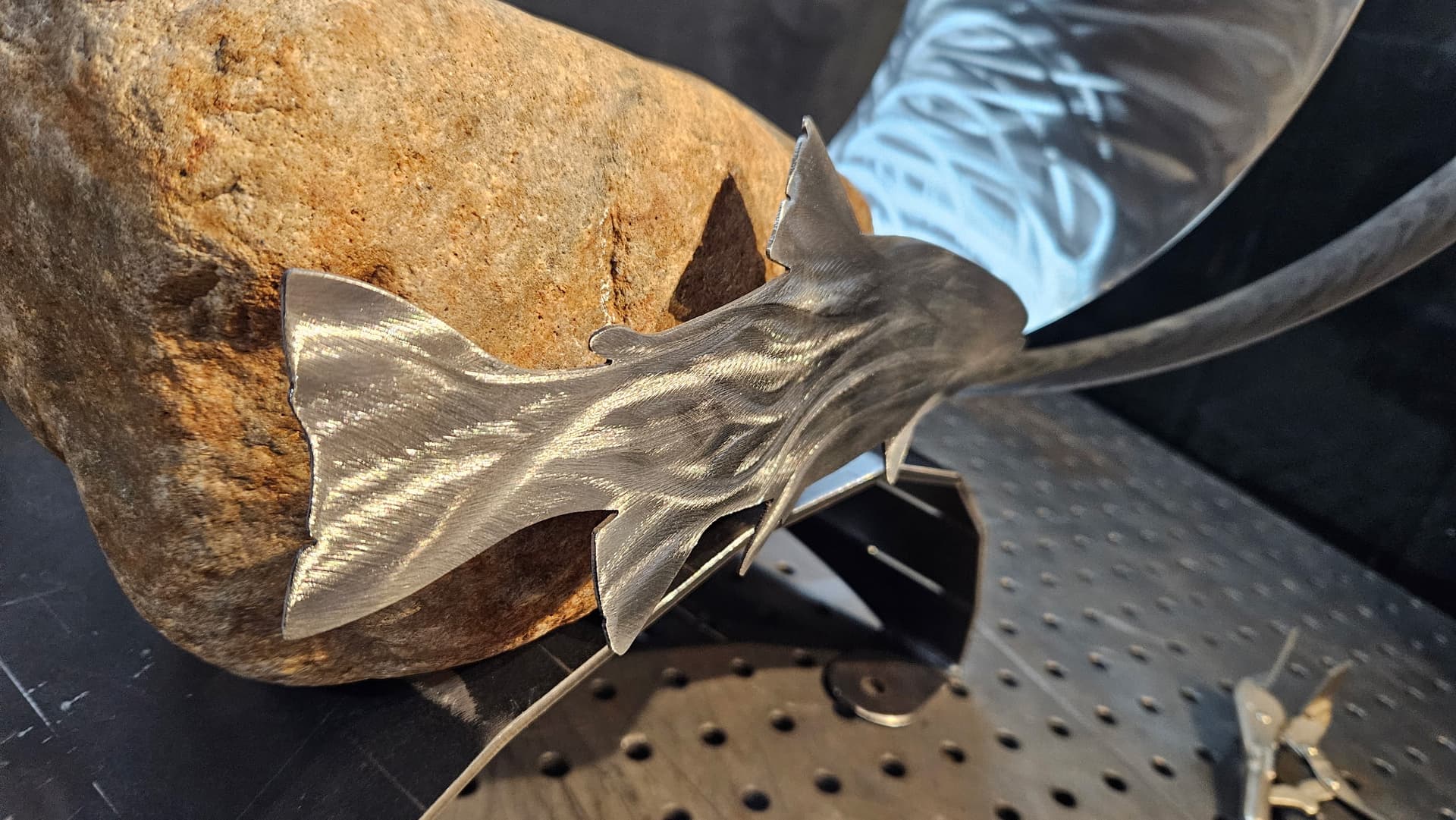 Shapeshift is ready for textured black powder coating. And one of the stainless hoops is going to get heat treated to Blue. The rock also needs to be acrylic sealed