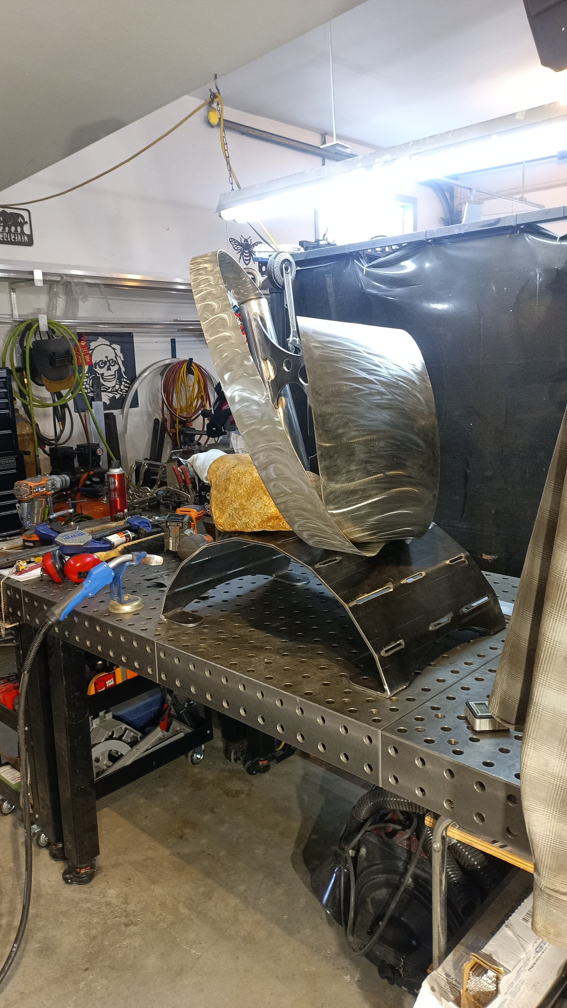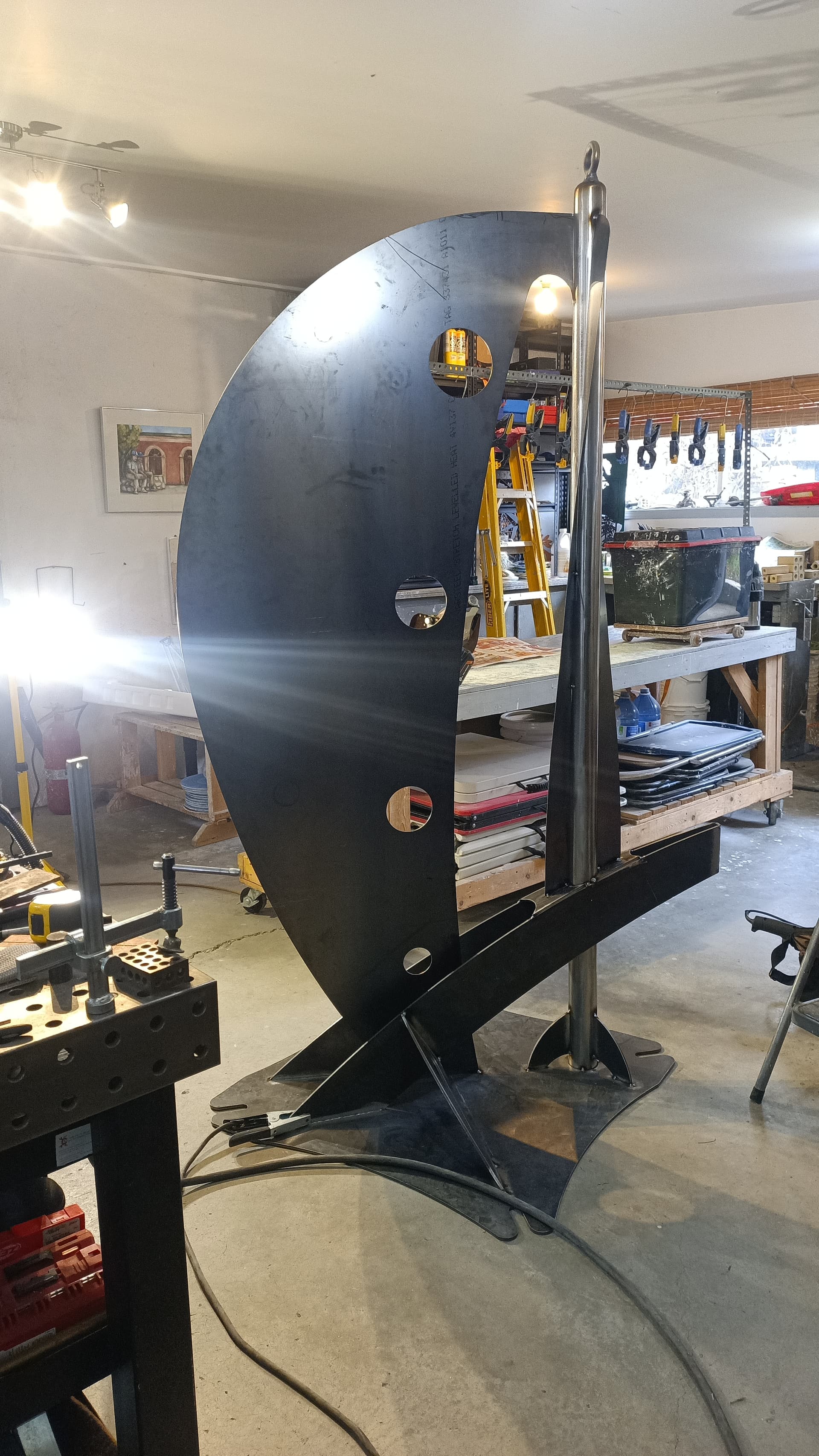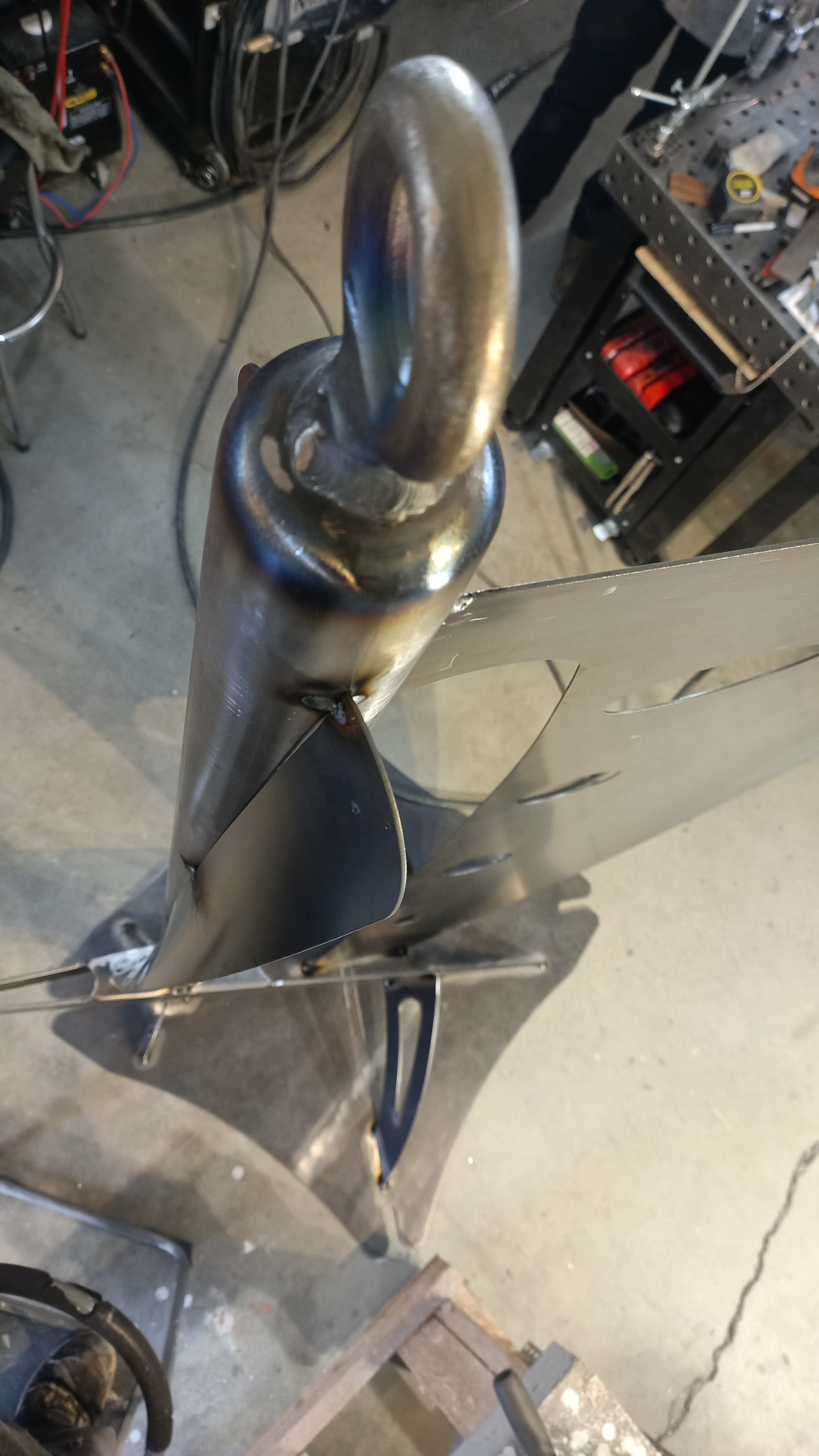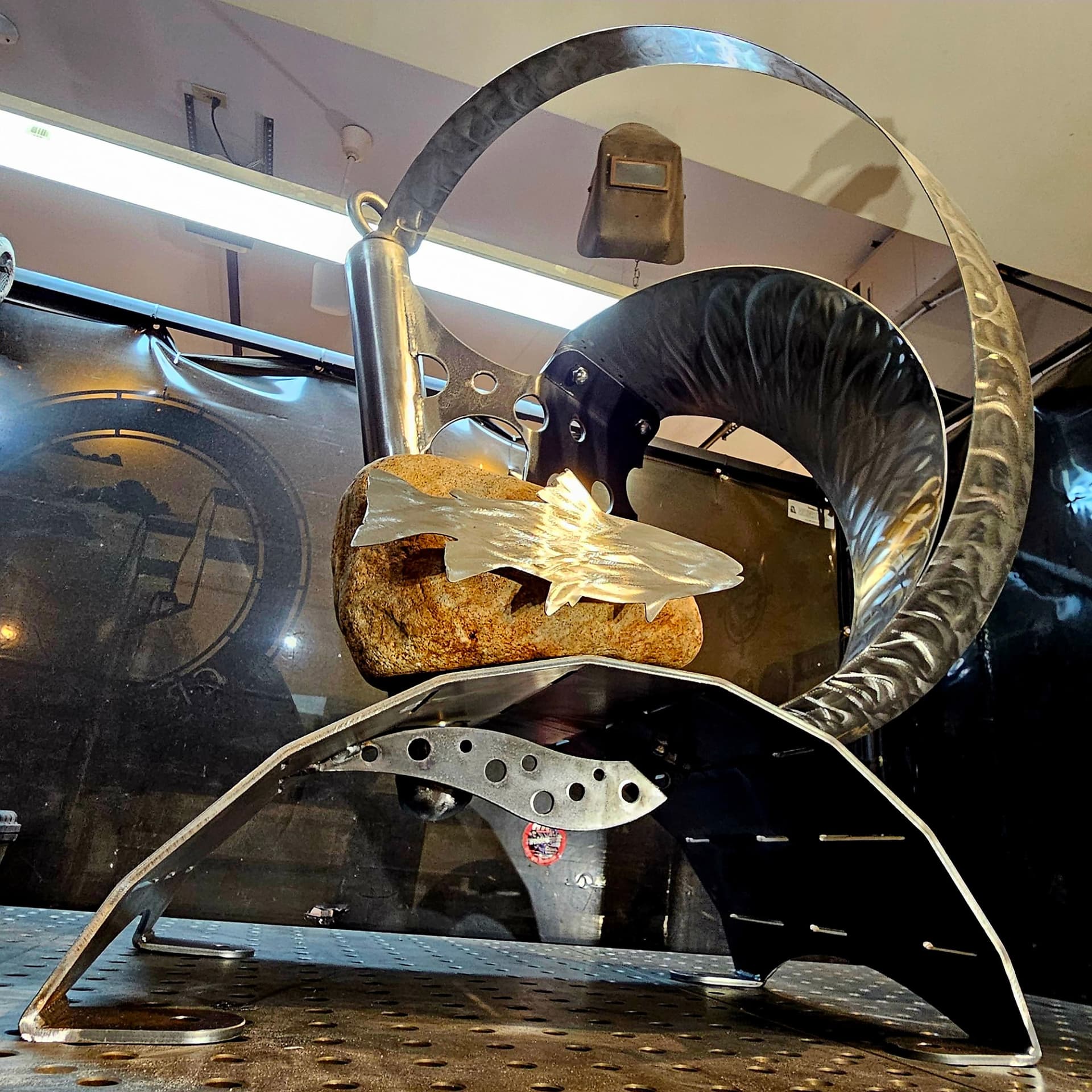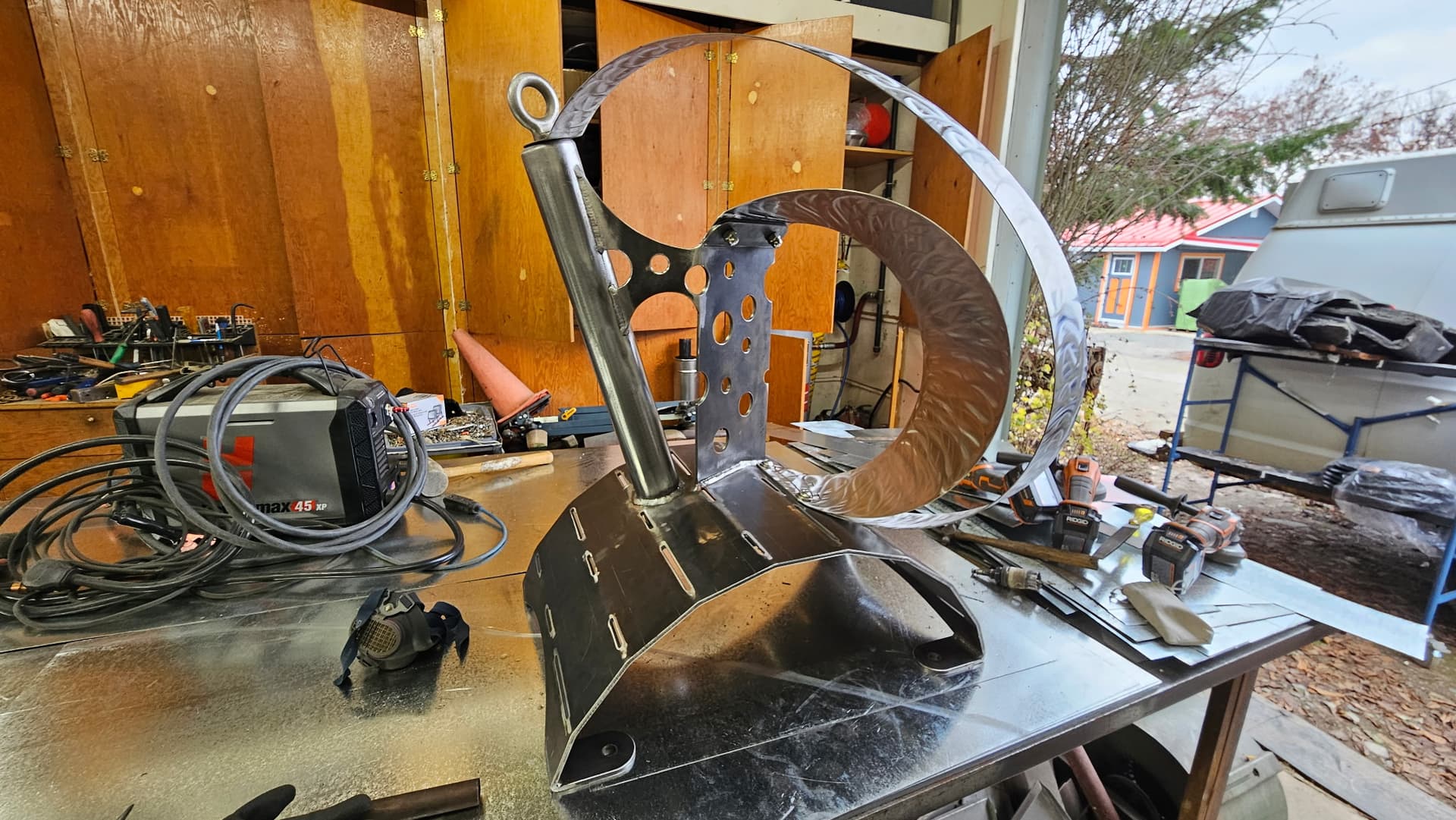 Shapeshift is ready for textured black powder coating. And one of the stainless hoops is going to get heat treated to Blue. The rock also needs to be acrylic sealed