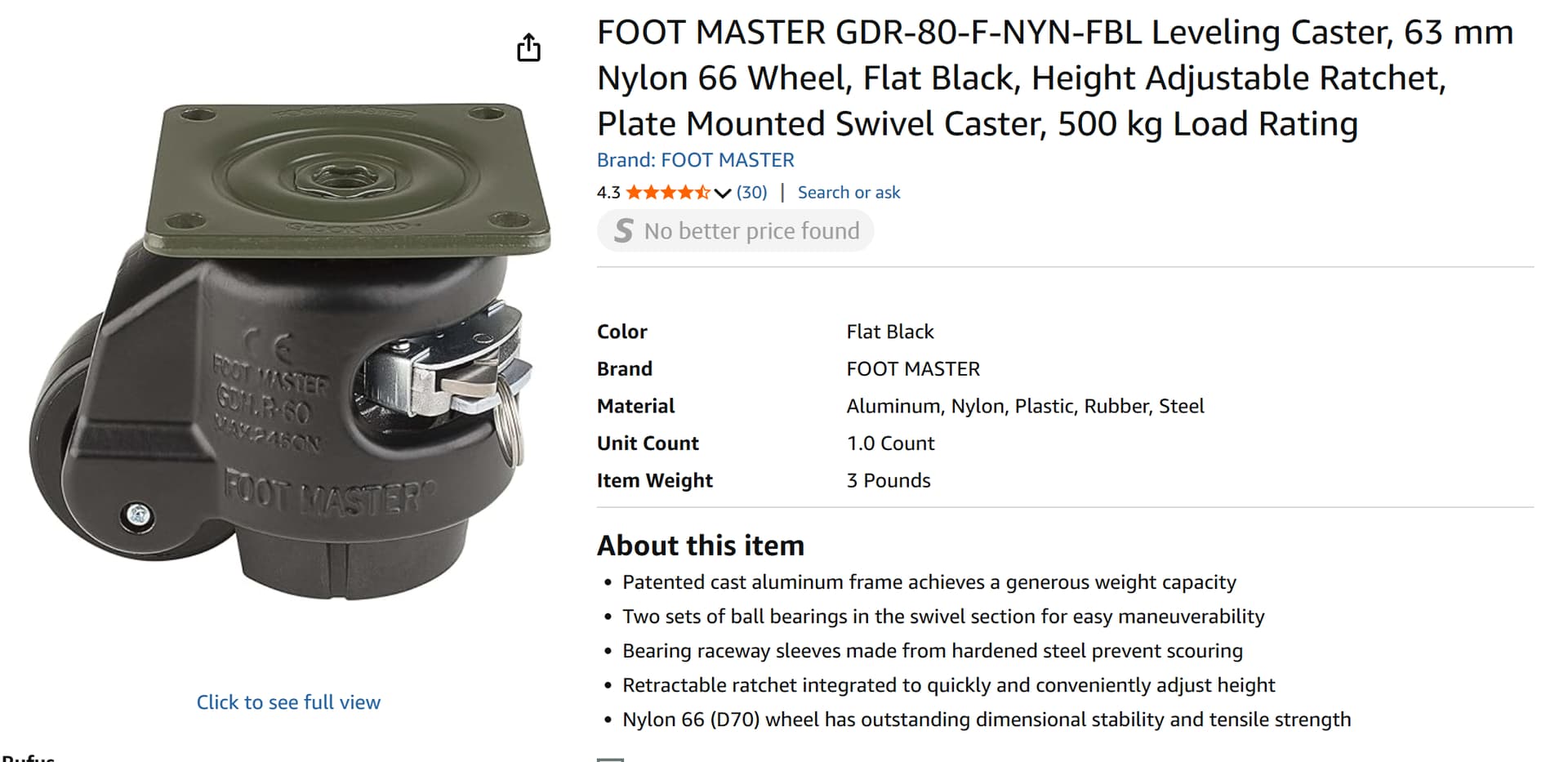 I have the ones BigDaddy posted and the ones that follow in the picture. I like the pictured casters because they have a lever that pulls out to ratchet the mechanism, then pushes back in out of the way. I find that the adjustment wheel on the first is more difficult to move. Big difference is the mounting method - stud vs plate.