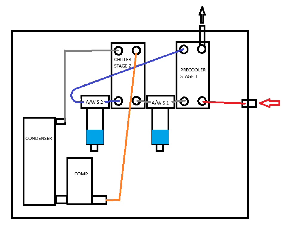 Just a thought experiment as to what could be put together if a refrigeration system already existed (mini fridge etc), and $100 was spent on some heat exchangers. I’ve crunched no numbers on it, and don’t even know what size refrig would be necessary. I just can’t see why they’re $600 at the base/entry and $X000 for the larger name brand systems. Also I figured using a regen system would help with work loss and efficiency of the system as a whole.