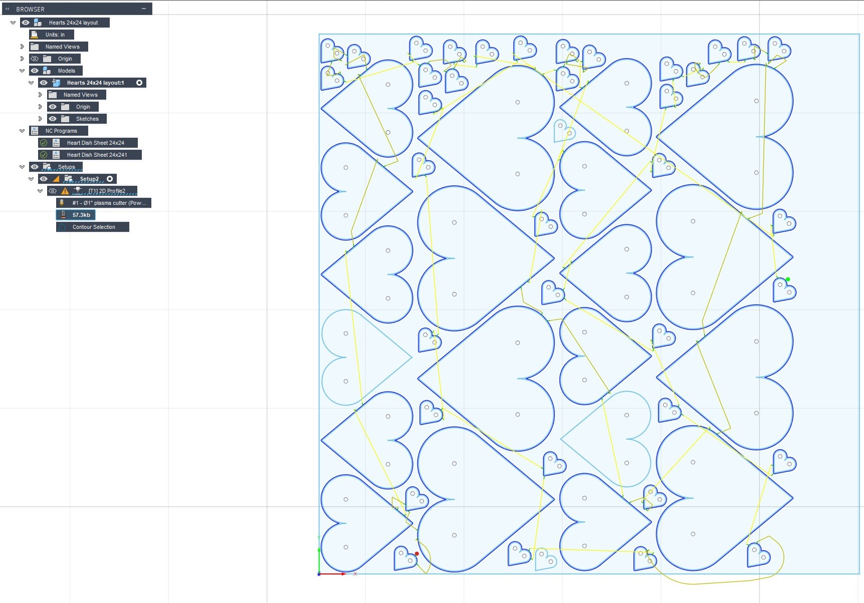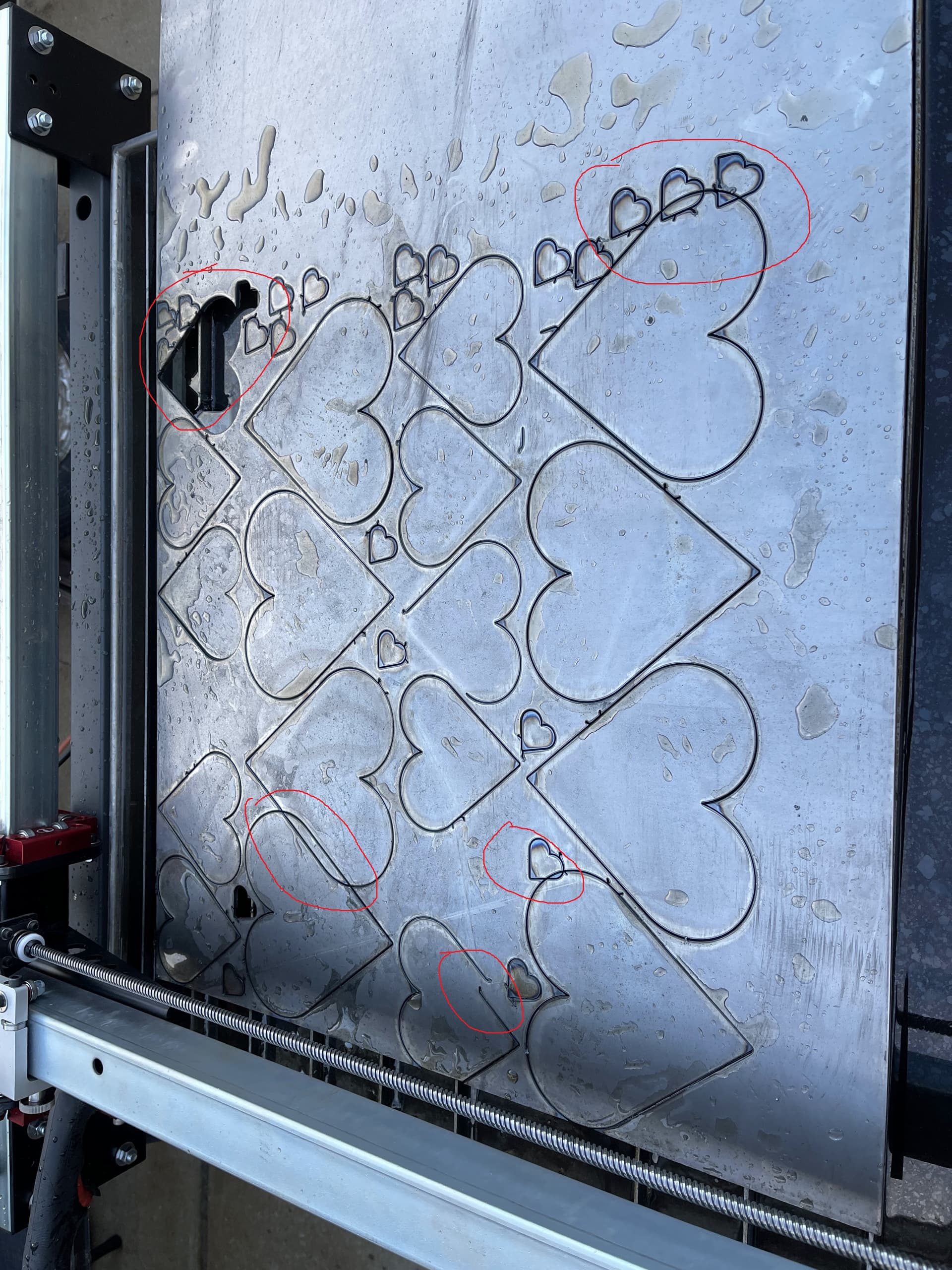 Hello. I have my Crossfire (OG Table with new controller) up and running. This is a new table that was never assembled before. I have been cutting single parts to dial in the settings. So far so good. I tried to cut a sheet of nested parts and the cuts are overlapping in some areas. The tool paths look great in Fusion 360, but the cuts are still overlapping. The attached photo shows the problem. I paused the program a couple of time trying to save some of the previously cut hearts (these are the incomplete cuts you see. The circled cuts are where the issues show up. There were not any tip ups. The missing parts were removed after the program was complete.