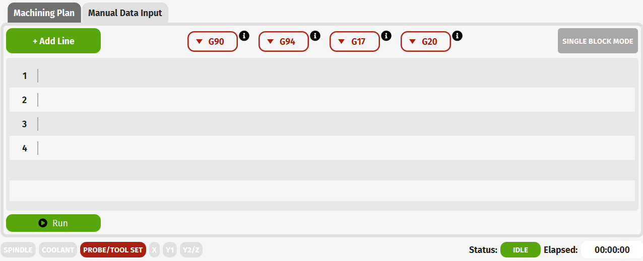 By selecting Single Block Mode you will also, just like Machining Plan, run each line separately. This will be ran just like a regular program using the Start Button on the top left.