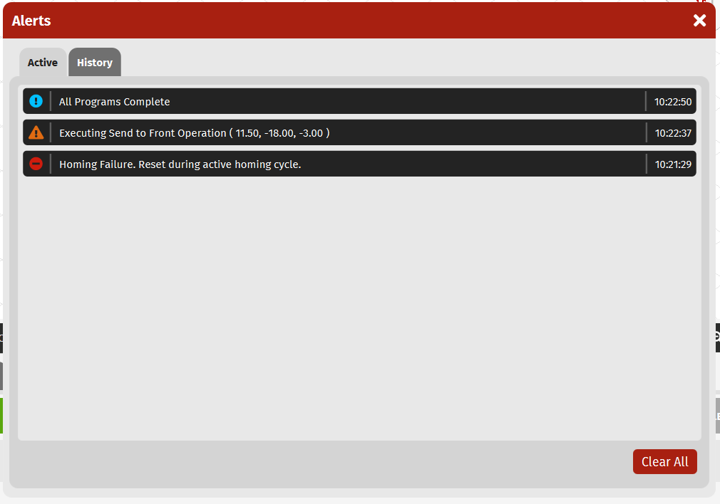 This Alerts popup will both have a currently active alarms tab that can be cleared, as well as a History tab that will only clear when CutControl is closed.