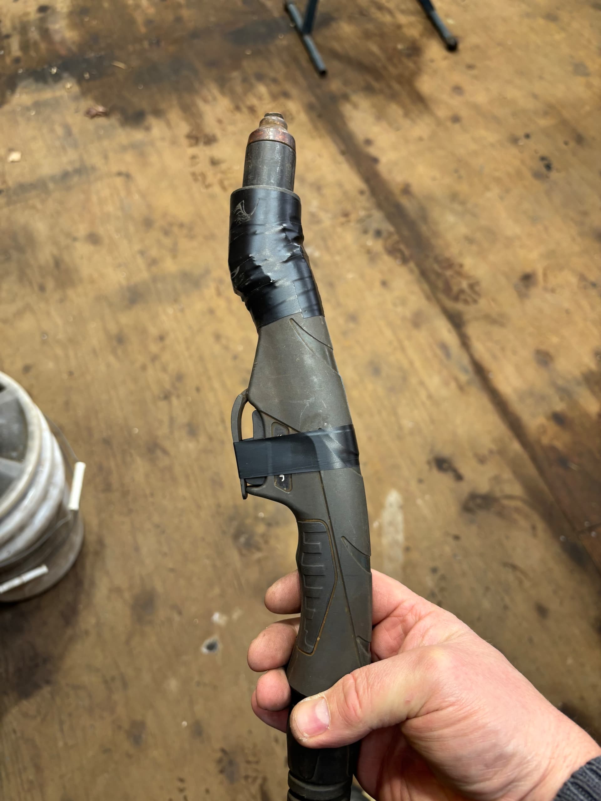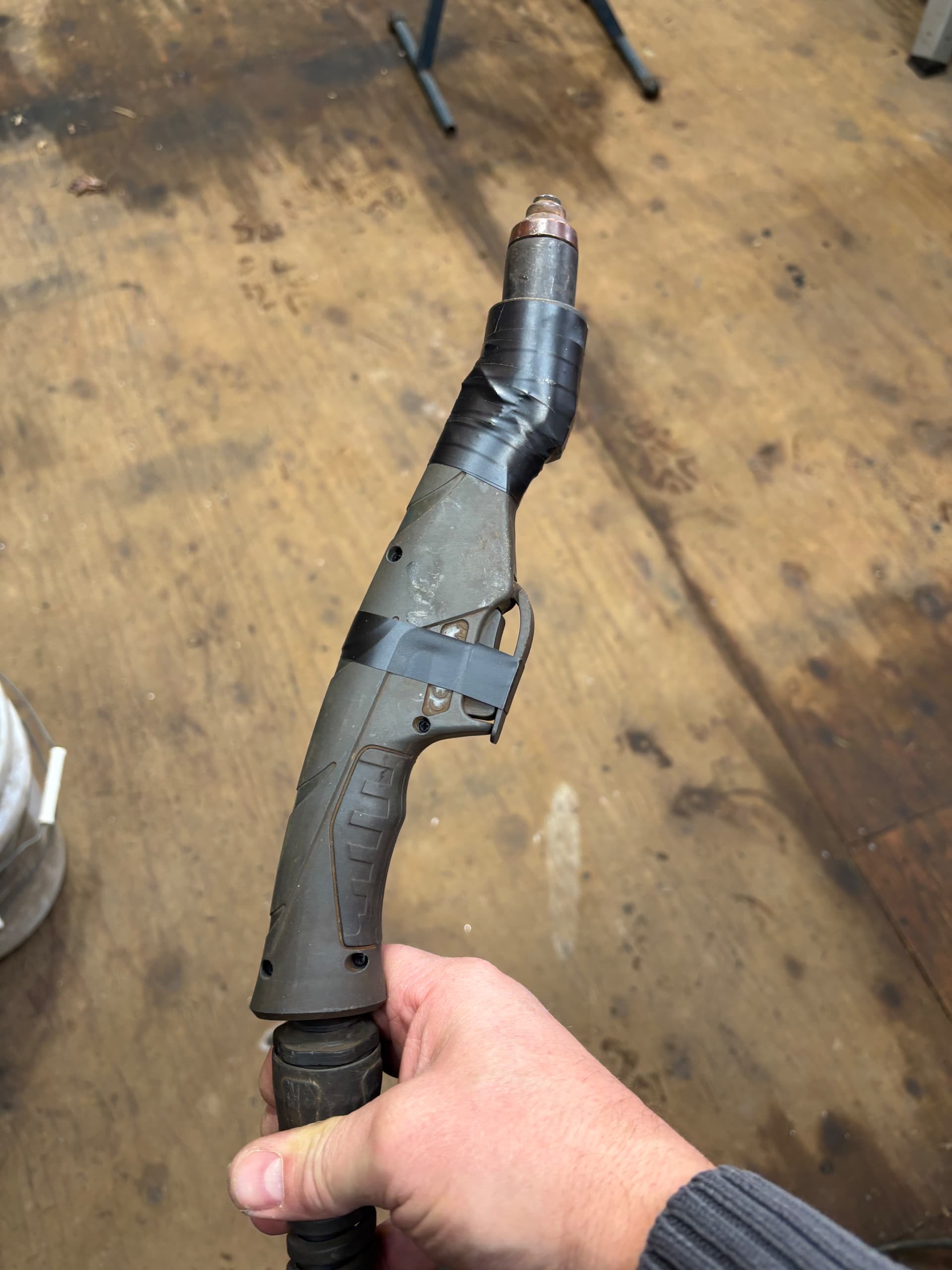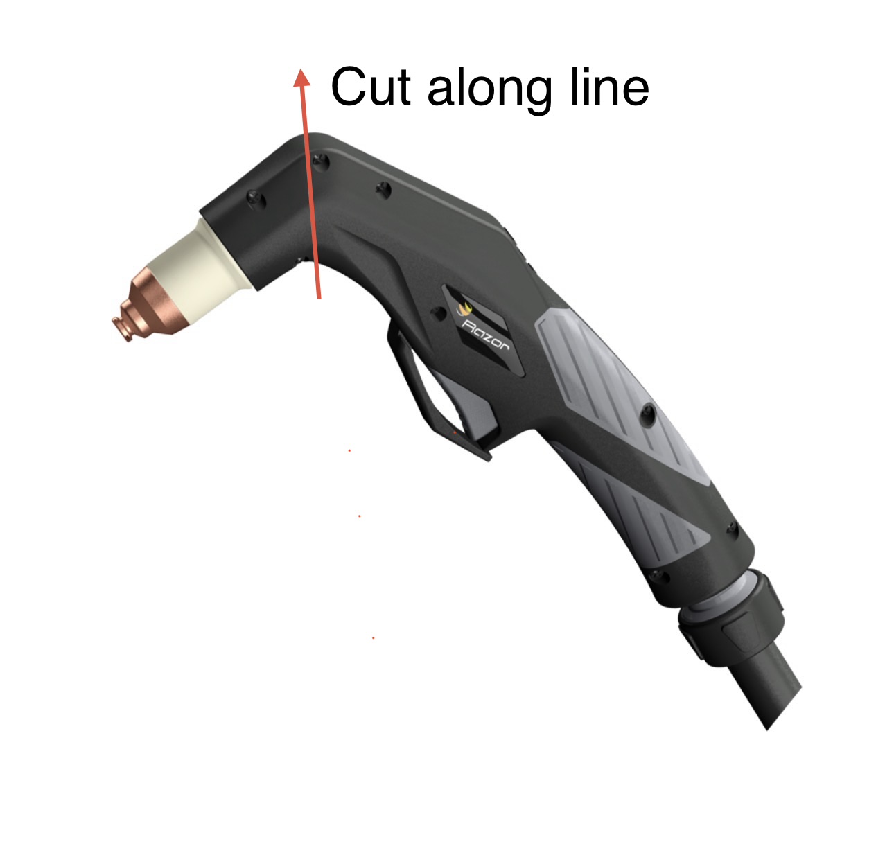 I took apart the plastic handle and gently removed the trigger, nozzle, wires and other components. Then I reassembled the plastic handle empty and cut along the right angle of the torch with an angle grinder: