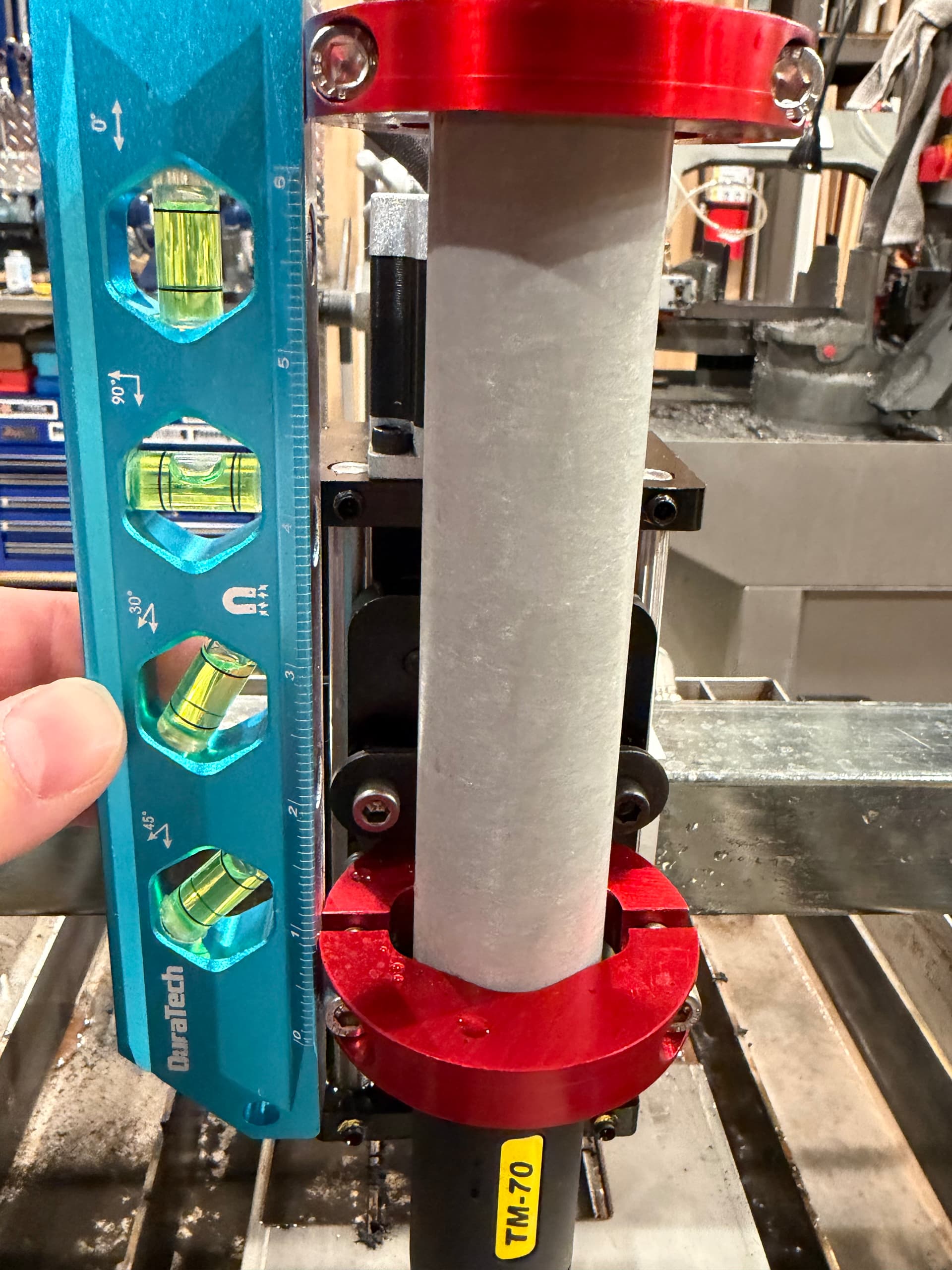 I took square and looked at torch compared with workpiece.. In the x axis, it was plumb. But in the Y axis, it was not.. I verified the Z-axis assembly was fully seated in the channel and the holder was seated in the z axis. (2 channels). Then I loosened and tried to see if there was any play in the x-axis gantry (8 bolts used to address sag of x axis). There was a tiny bit of play, so I closed gap about 1/64. Then I used brass shim stock .017” to get as plumb as I was able.