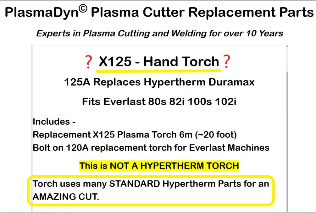 The duramax torch I have on my 102i is a hypertherm duramax torch adapted to the everlast 102i. The torch is a hypertherm product and uses hypertherm consumables. I buy my consumables through plasmadyn and am pleased with both. Hope that is what you were wanting to know…
