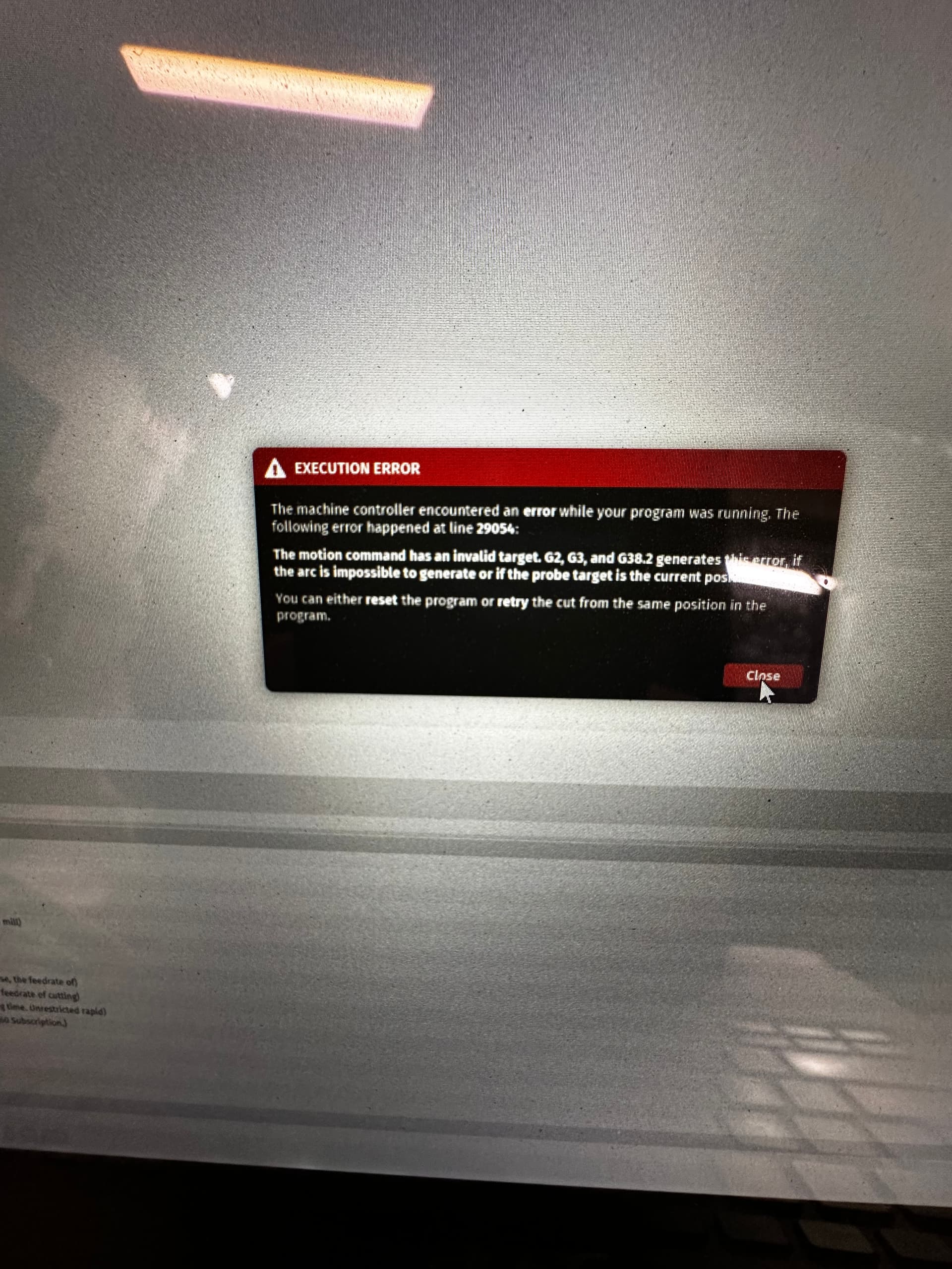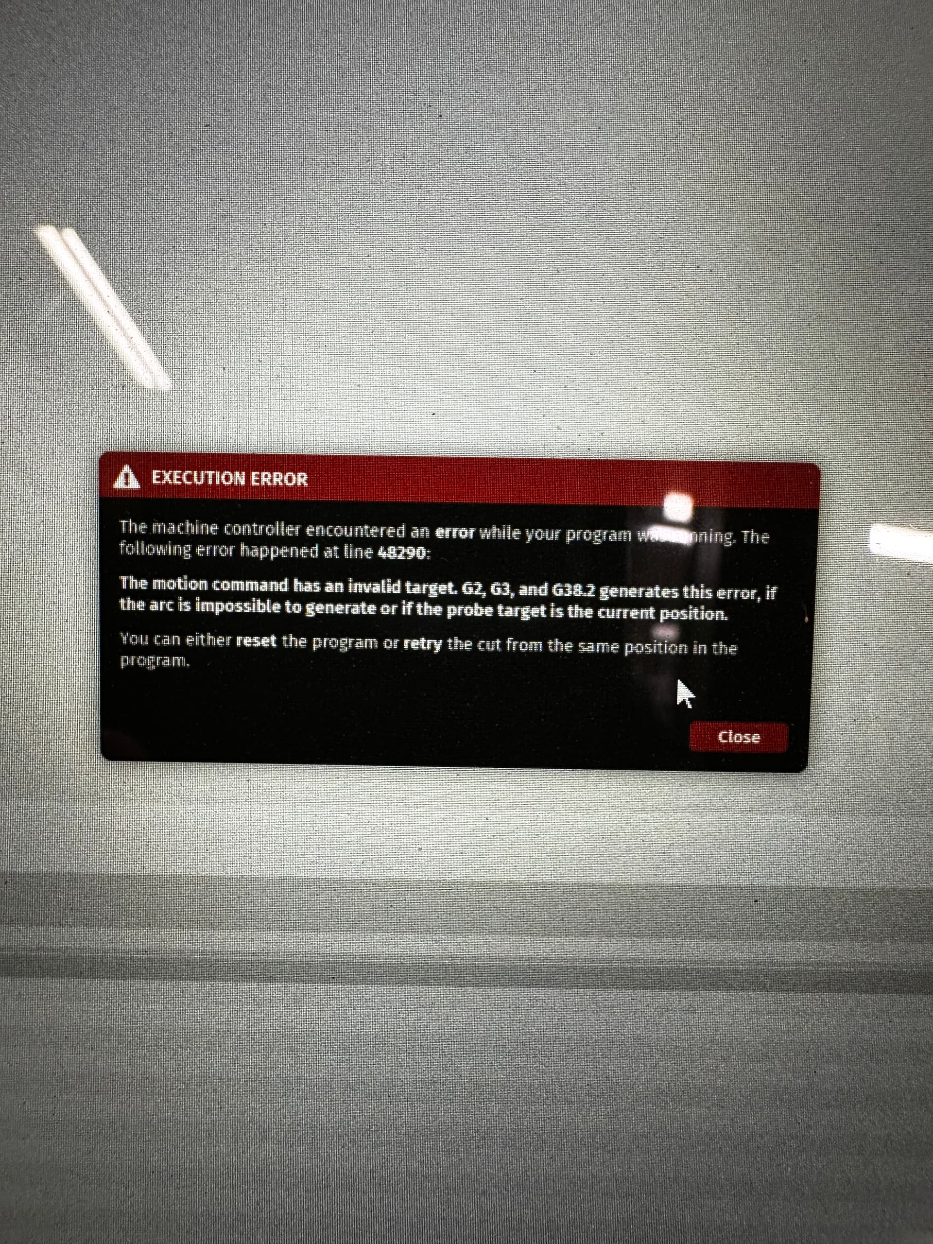 Got an error more than halfway through my first real program. Mill just resets and says it needs to home, and no way to restart there. Tried deleting the first 48000+ lines but then it didn’t go back down to the correct cutting height. This is straight out of fusion 360. Any ideas?