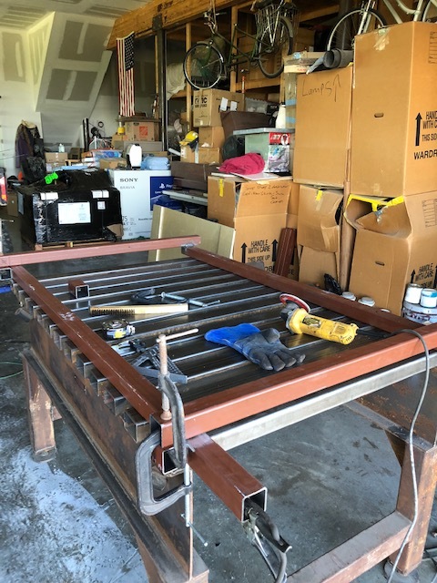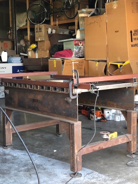 Started making the frame today… used cabinet saw to cut a perfectly square template then clamped it to welding table and tacked it. Should turn out nice… should get about 4’8” of Y axis travel.