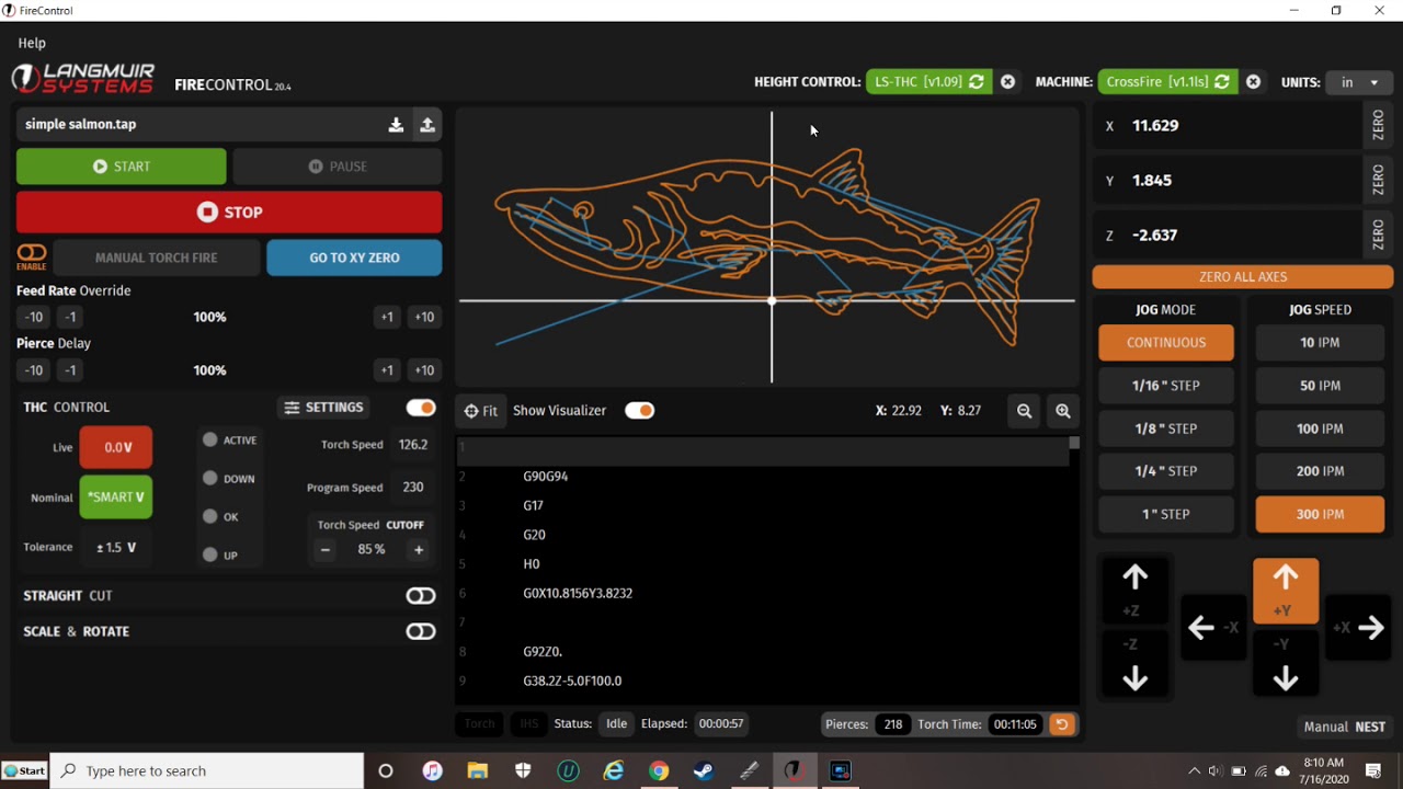 Now i do know if paths get to close and the arc goes off the metal a little it can cuase issues like this. Or if the lead ins are too short ect. My torch raised up on the last peice on a straigt cut with no other cuts near by, no edges near by and it was a long straigt cut and during the middle of it the torch just randomly raised. I give up on the THC for know until someome can tell me what i am doing wrong or Langmuir makes some updates to the software.