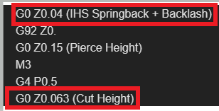 Your g-code has these two settings (Springback/backlash and cut height that will determine the cut height). Since it is plate thicker than 10 gauge you don’t need the additional springback since the metal will not flex that much. Your g-code will be adding the springback/backlash to the cut height (0.04+0.063=0.103). You will be a full 0.04 inches higher than you want to be.