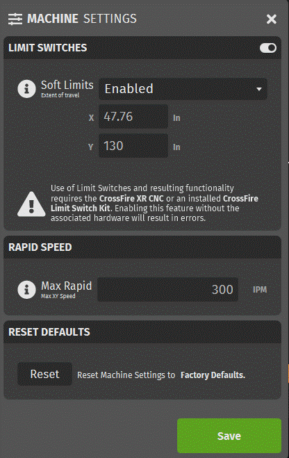 I then go into Machine settings and enter the values x =47.76 y=130 for soft limits.