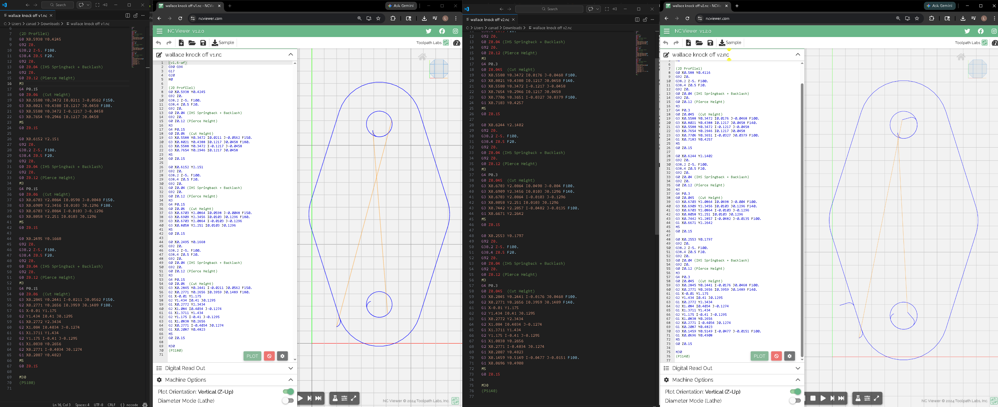On version 1 I see you have a Pierce delay (g4) of point .15 add on version 2 you have a Pierce delay of .3 . Both of these are inadequately short Pierce delays on the Langmuir pro table. The Langmuir pro has about 0.5 second delay from the software triggering the fire relay to the torch actually firing .For 18 gauge I would start at .5. This alone would probably fix the issue.