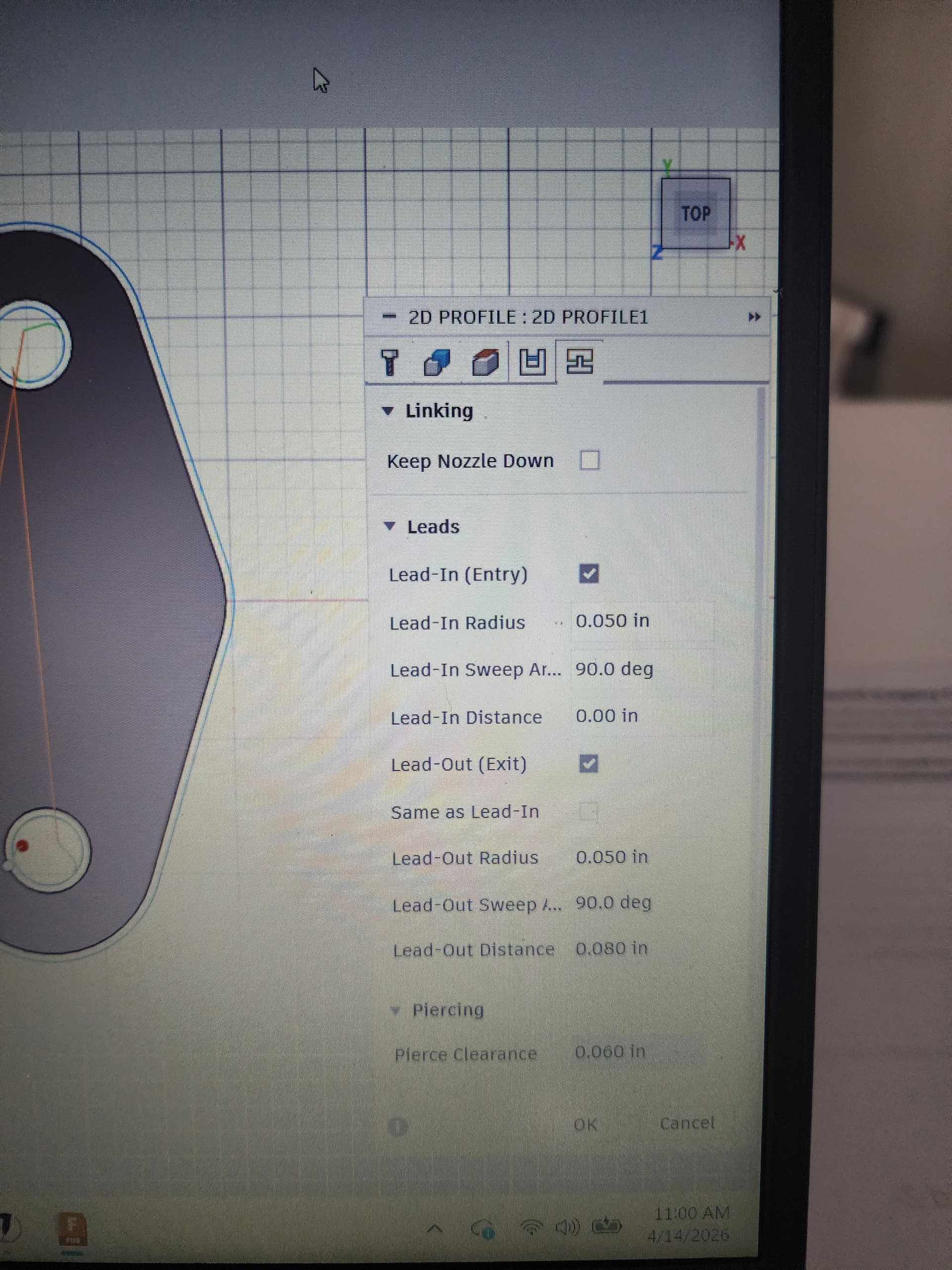 On this simple bracket in 18 ga you shouldn’t have to apply any added features in the 2D profile. menu. You could probably get away with the straight 90° lead in with no lead out, I would not be doing any feed rate optimization, and I would get rid of the overcut setting. With this thin material like don’t think you’ll even need a radius lead in.