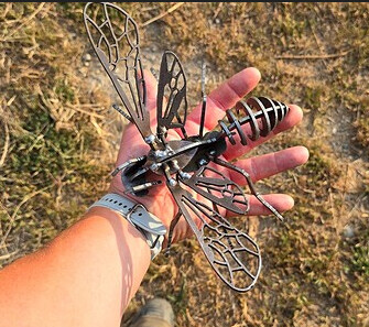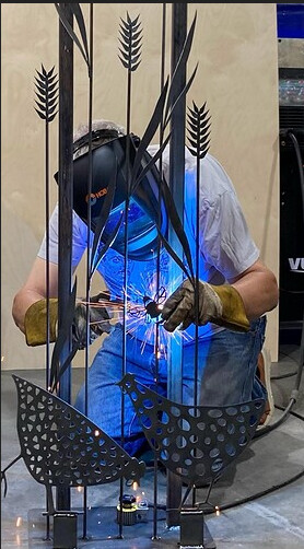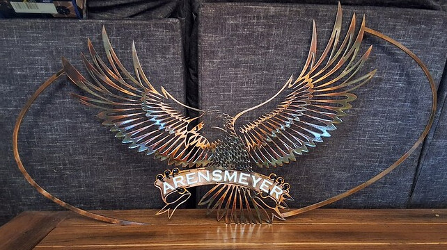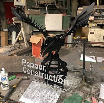 7 months in the making. Every step of the way was a new learning experience: making a low-poly design out of steel (watched a ton of paper craft and cosplay construction videos), making a wire buck and forming steel with an english wheel (watched many custom car body work videos), forming a curved surface with 3D scan data, creating a curved-surface flat cut pattern using Blender’s UV unwrapping and finally pouring an mounting base using Quikrete and anchor bol…