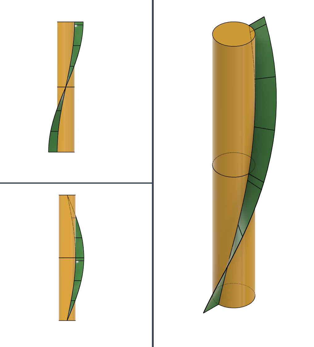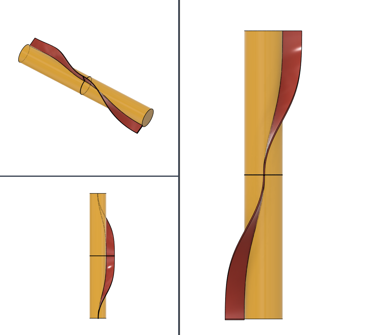 @Muddr thanks again for taking the time to post this. I had some time this morning to start dissecting this. I love the simple workflow. The only problem I have with it is that the shape is not a geometrically correct twist/coil. I’ve stacked two of your examples on top of each other and I think this really highlights the issue with this geometry. I also superimposed a geometrically correct twist/ coil it’s on top of the one you presented.
