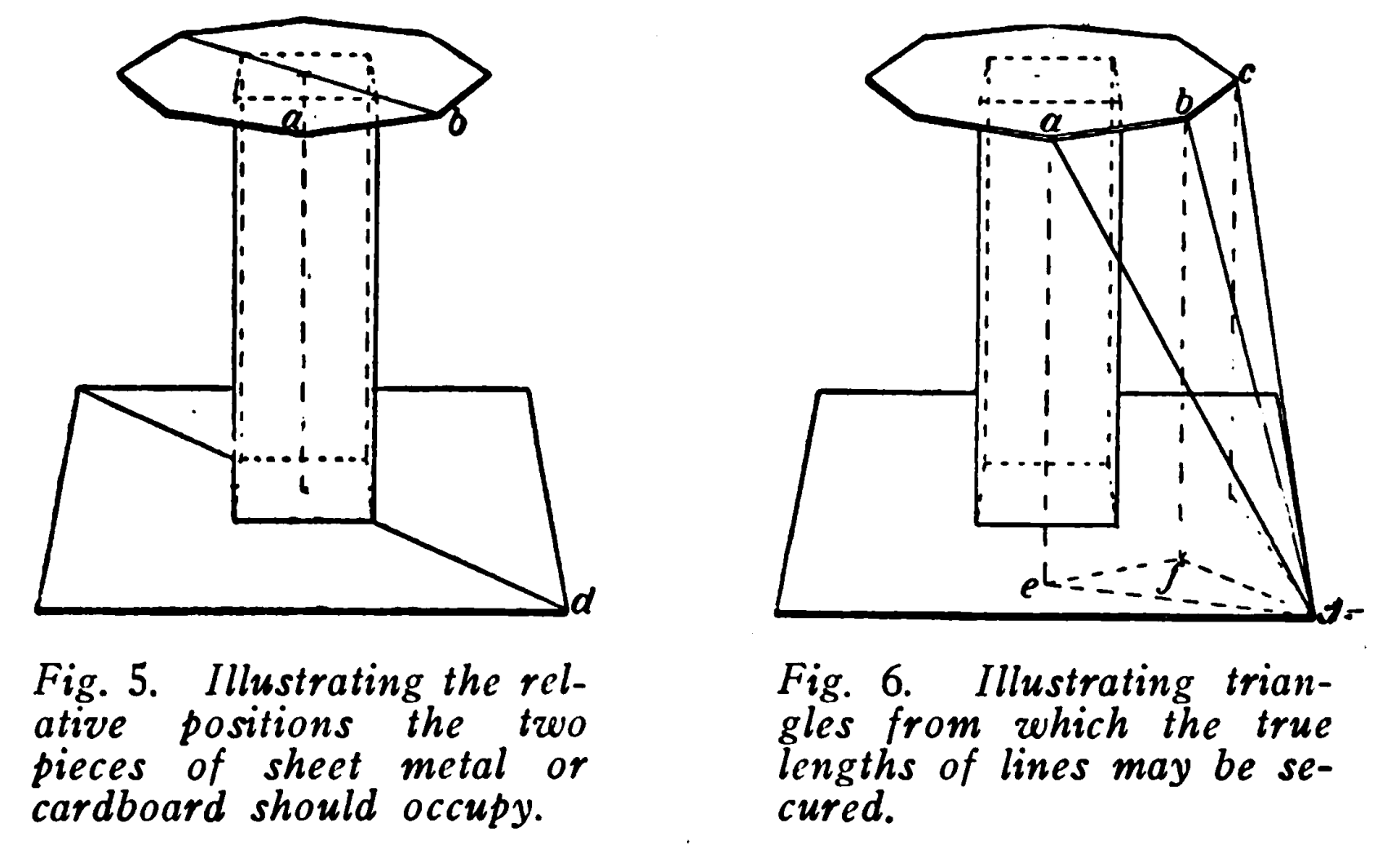 “TRIANGULATION CHAPTER I. ELEMENTARY PRINCIPLES. Triangulation is a term which has in recent years been applied to certain operations in Sheet Metal Pattern Development, although said operations have long been explained in works upon Descriptive Geometry, where is found the declaration that the true length of a right line in space may always be found in the hypothenuse of a right angled triangle, whose base is equal in length to the horizontal projection of the line, and whose perpendicular is equal to the difference in length of the vertical projectors from the extremities of that line. Triangulation as applied to sheet metal pattern development, is the act or process of dividing into triangles, also the results thus secured; specifically, the laying out and accurate measurement of a network of triangles presumed to be upon the surface of the object, and shown upon its geometrical representation which has been correctly delineated. Triangles with which we deal are considered as plane triangles, although not strictly so, since a plane triangle is presumed to lie in one plane, and is bounded by three right lines. A triangle which is presumed to be a portion of the curved surface of an object will not lie in one plane. In many instances one side at least of said triangle is not a right line but a curved one. Thus many triangles involved in triangulation as applied to sheet metal pattern development are mixtilinear triangles. However, the magnitude of the variation is so small, that it may consistently be considered as a negligible quantity.”