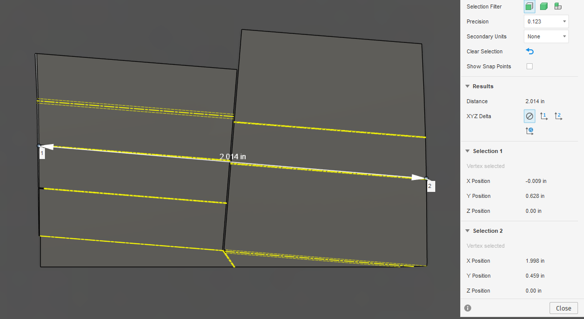 But I think the diagonal measure is showing more than it really has. I also thought I should extrude one of the flanges on the right toward the center. It allowed it and made a flat panel but you can clearly see that flange is colliding with the other side now.