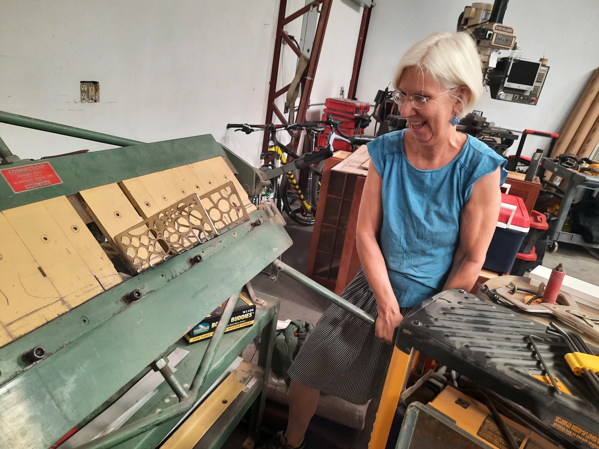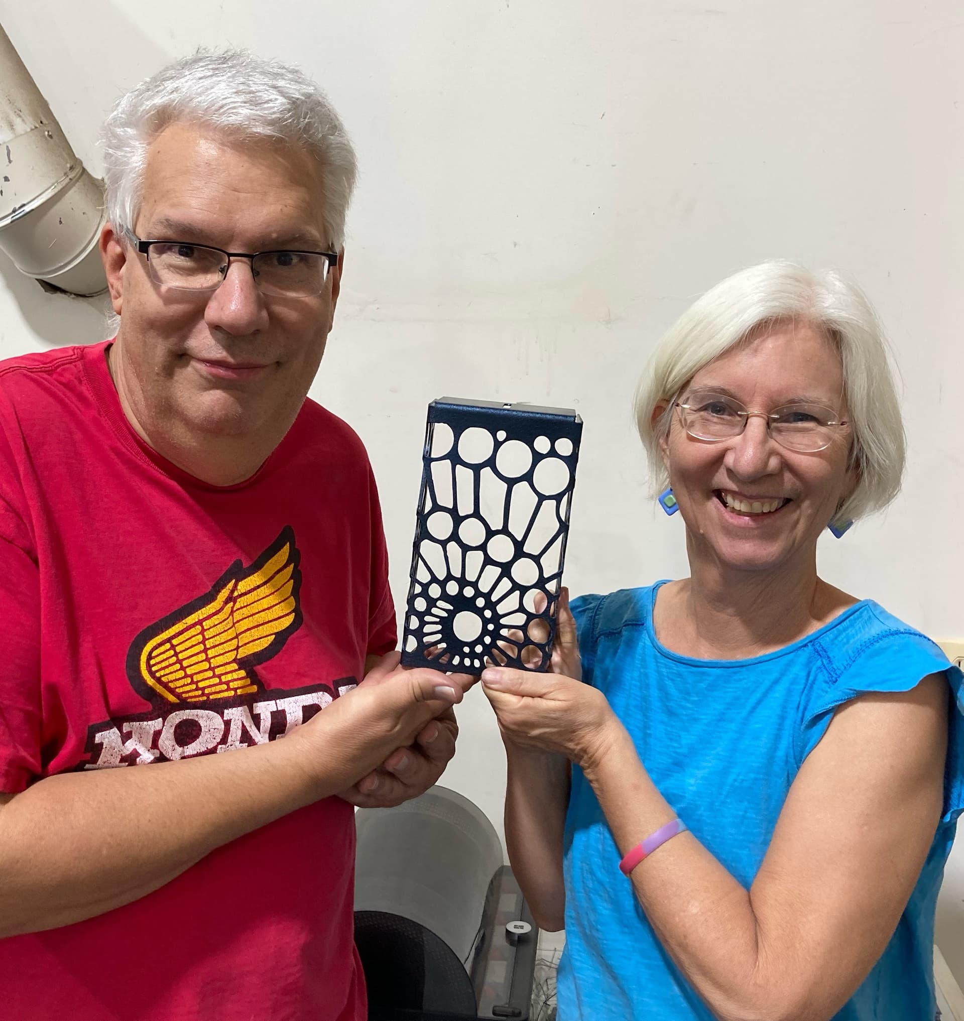 My sister surprised me by showing up Friday for my 60th. We spent the afternoon in the shop working on decorative shade for her back porch light. Started with a downloaded jpg pattern, cropped with gimp, traced it using inkscape, used Fusion 360 for sheet metal 3D design/flat creation, then sheetcam, fire control, wire wheel, scotch brite, pan brake, powder coat then bake. 2 hours later, we had a beautiful back porch light cover. She did most of the work and it turned out simply beautiful. She’s never used a plasma cutter, grinder, brake or powder coating. She already working on another design.