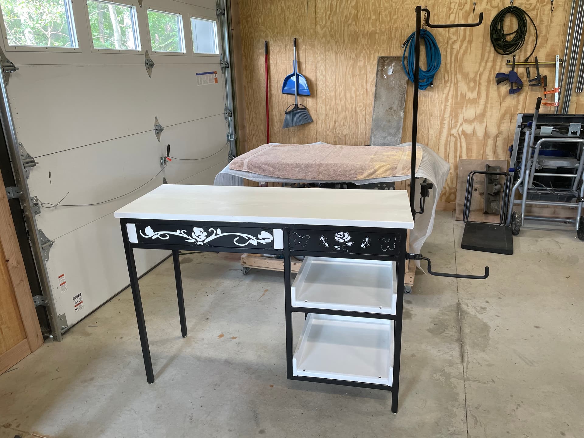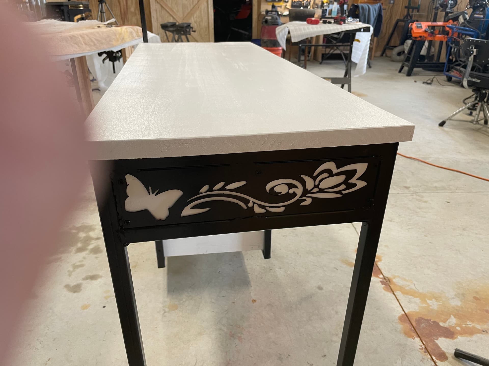 So this took a while and a bit of welding on 1" square tube. My daughter wanted a laundry table to fold clothes on that hang up stuff for her laundry room for a birthday present. I decided to use my crossfire for some simple designs to make it pop