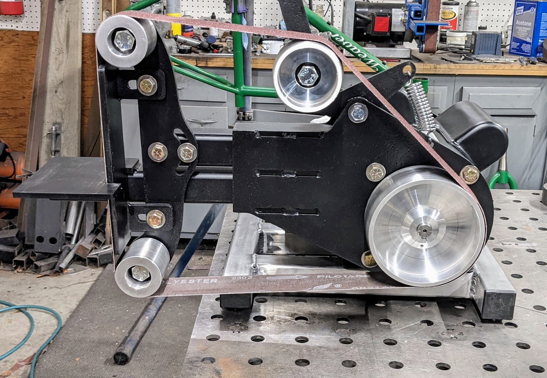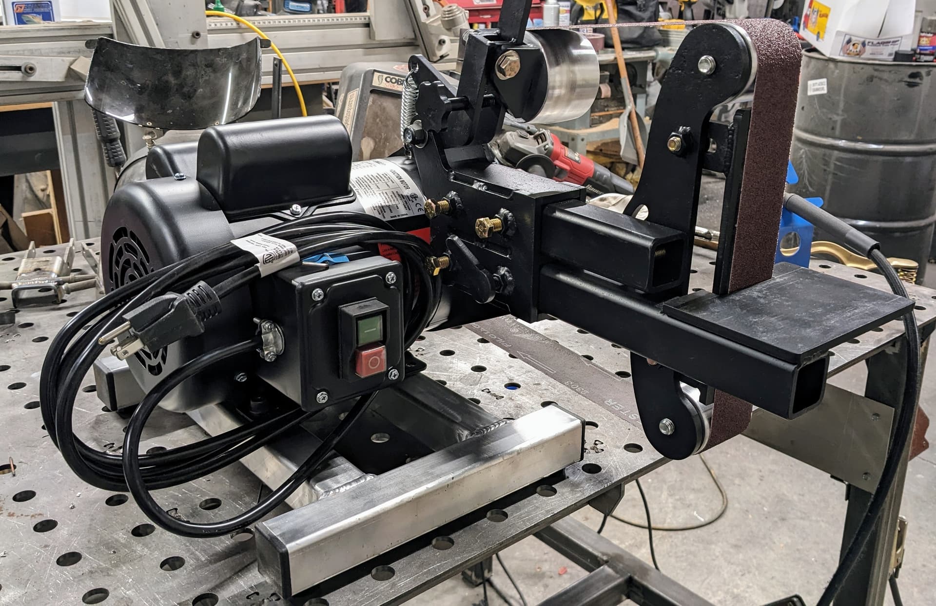 I made another 2x48 belt grinder for my neighbor. I went with a single phase 120v motor on this one to keep the cost down and keep it simple. The lack of speed control makes initial belt tracking adjustment a challenge. I got it close by turning the belt by hand and then fine tuned it while running.
