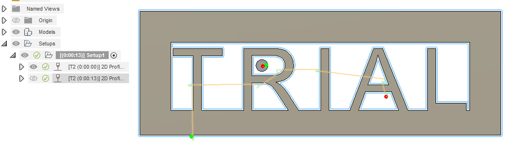 This is a practice single line cutting project for one of my practical Fusion 360 videos. You can see in the middle there’s two artifacts, a circle and a squiggly line that the program cuts first before entering the actual final cut pieces.