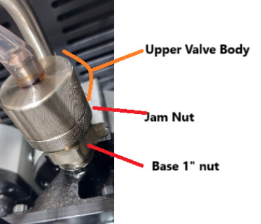 To tune up your PRV, you will want to loosen the jam nut downwards slightly, turn the upper valve body about 90 degrees tighter to the right, and then tighten the jam nut upwards to secure the assembly again.