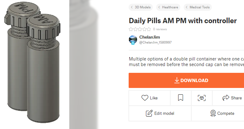 Two nights ago, I could not sleep. I was trying to figure out a travel medication bottle that would prevent me from taking my evening meds in the morning. It turned out to be a simple challenge and I designed it about 1:30 am and had a working model by 5:30 am. I have now shared all the files on Printables.com.