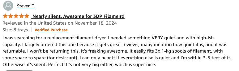 I have posted this item before and still really like it. The price has gone up but compared to my filament dryer that is limited to 6 hour duration and max temp of 122F, this dehydrator runs for up to 10 hours with a top temp of 158F.