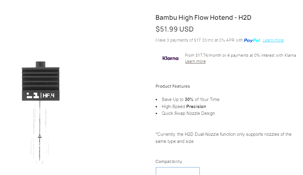 I have been using this one in the H2D. No problems and great for the speed with larger prints. It is included with the large package (laser and cutter) but finding it in stock is really challenging. I signed up to be notified and just happened to find it in stock (never notified), bought it and 2 hours later was “out of stock” again. I have not seen it in stock again.