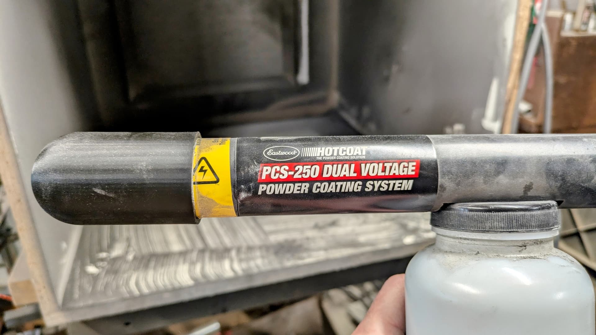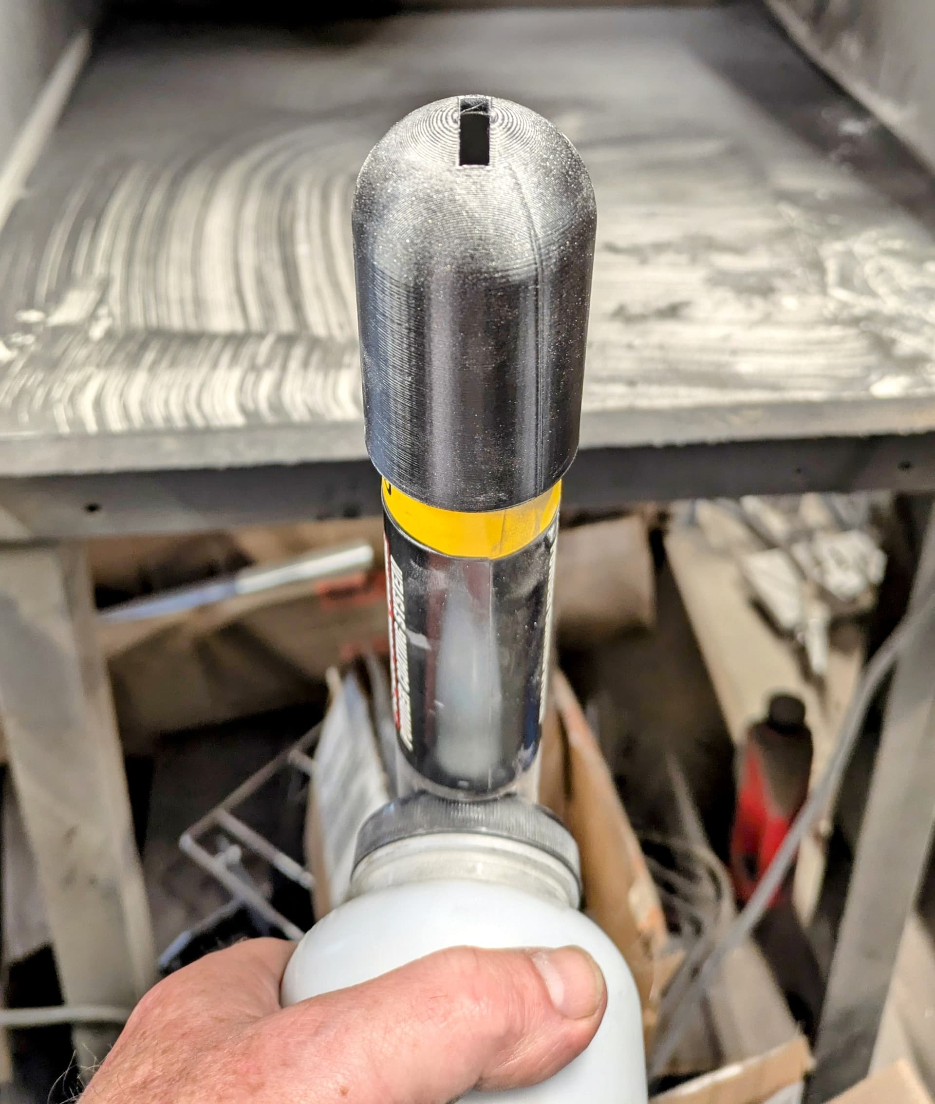 I never liked the big cloud of powder that comes out of the stock gun and I printed a nozzle extension to reduce the cloud and direct it toward the part. It was an improvement, but there was still a lot of powder that went past the part.