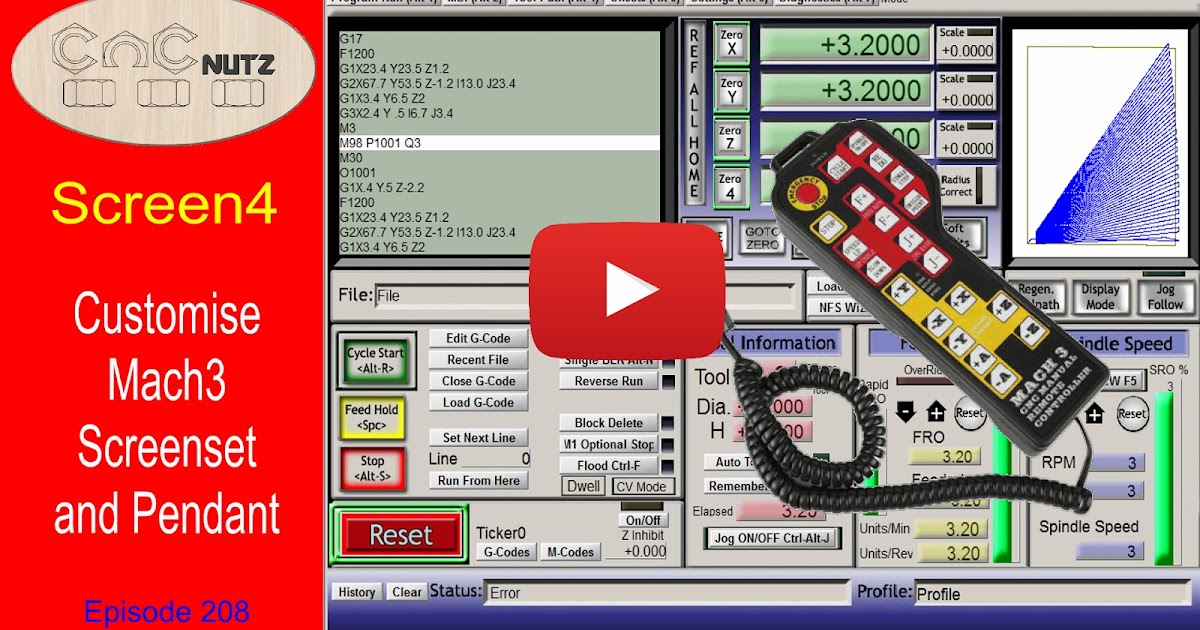 So I ordered the 4 axis pendant controller for my Crossfire and it didn’t control much other than X and Y after setting the hotkeys. Started searching around and found a few videos and then I found CNCnutz’s video and blog page. He shows you how to set up the screen for the penadant but tried it several times with no success. On the blog he has the modified Screenset like he did in the video in imperial and metric so you can just download and put the file in your Mach3 main directory and then change Screenset in Mach and it works great. Love having the pendant and it has a E-stop button so now I just use my shop desktop I have mounted on the wall for the table and have full control with the pendant.