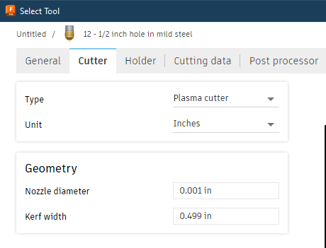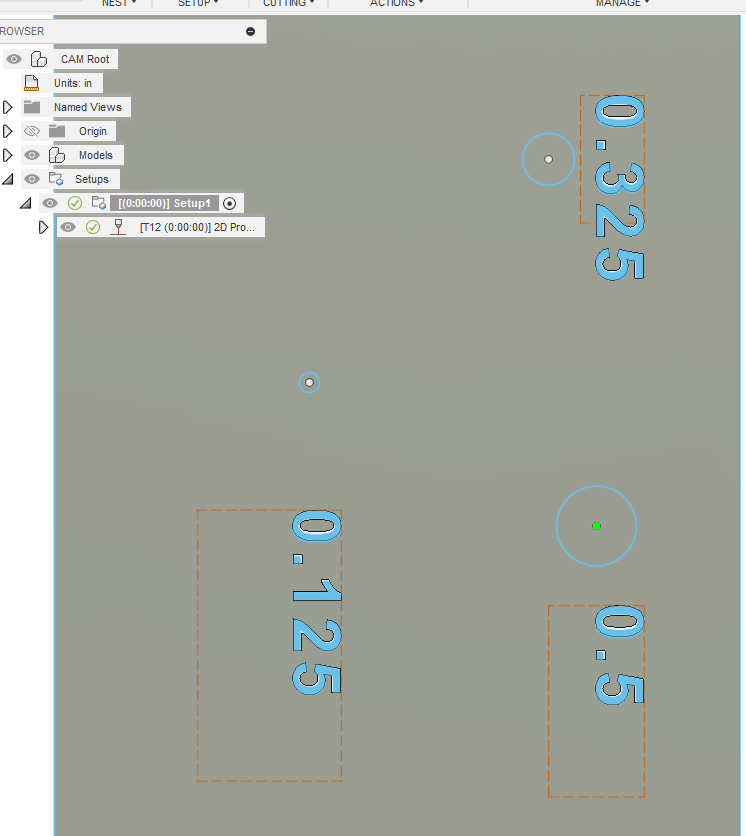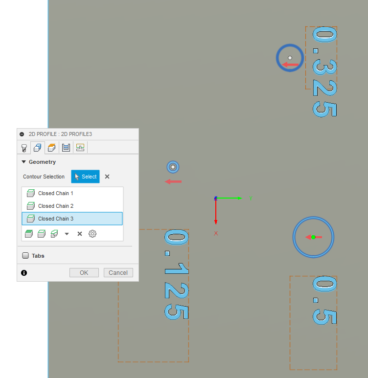 Here I have three holes. For illustration I labeled each hole. In the tool path I select my tool that has the kerf width that will just barely fit into the center of the hole: 1/2" hole tool will have a kerf width set to 0.499.