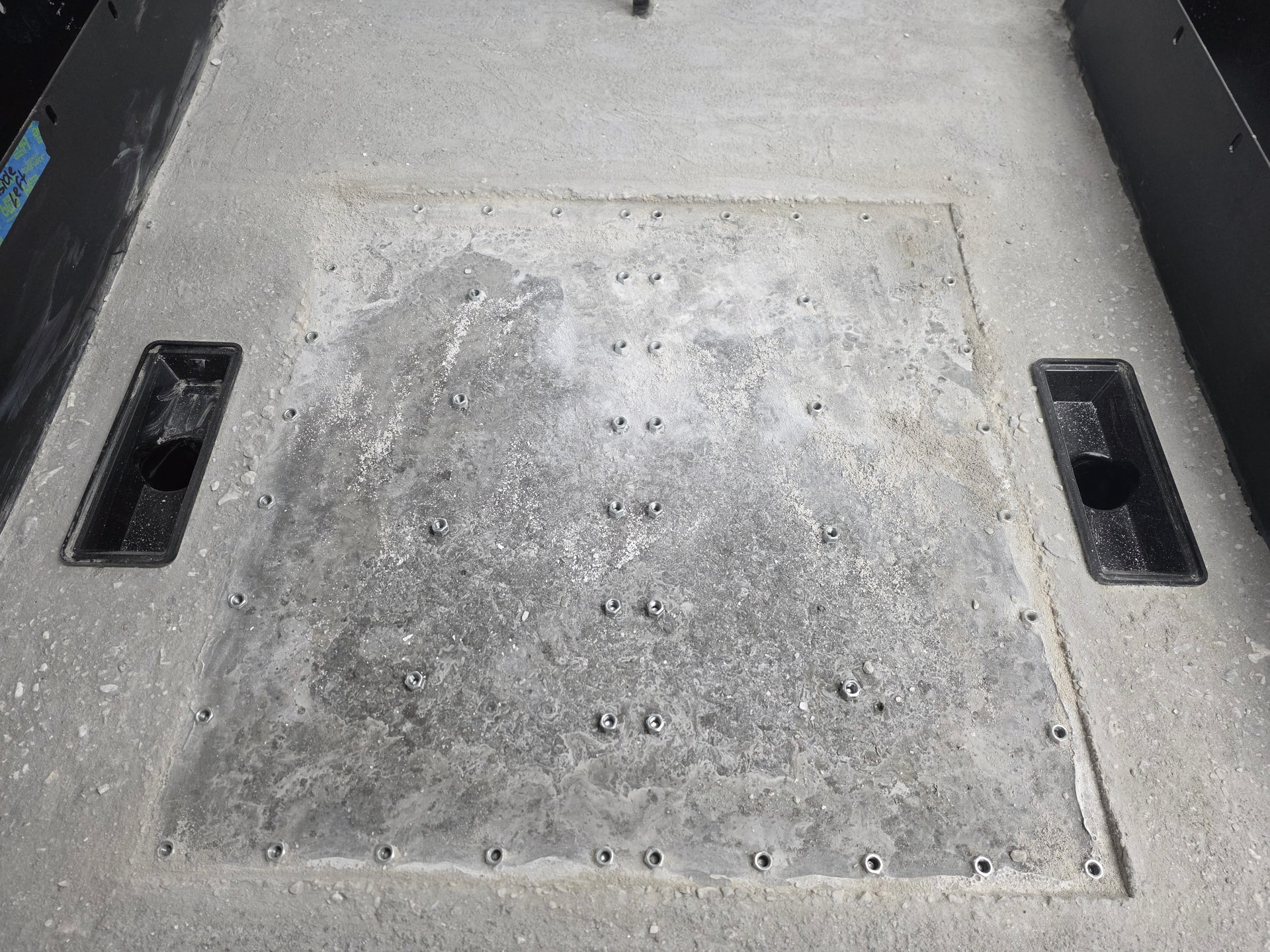 Threaded in 1/4-20 countersunk screws with an o-ring slipped over the threads into every concrete anchor as a plug.