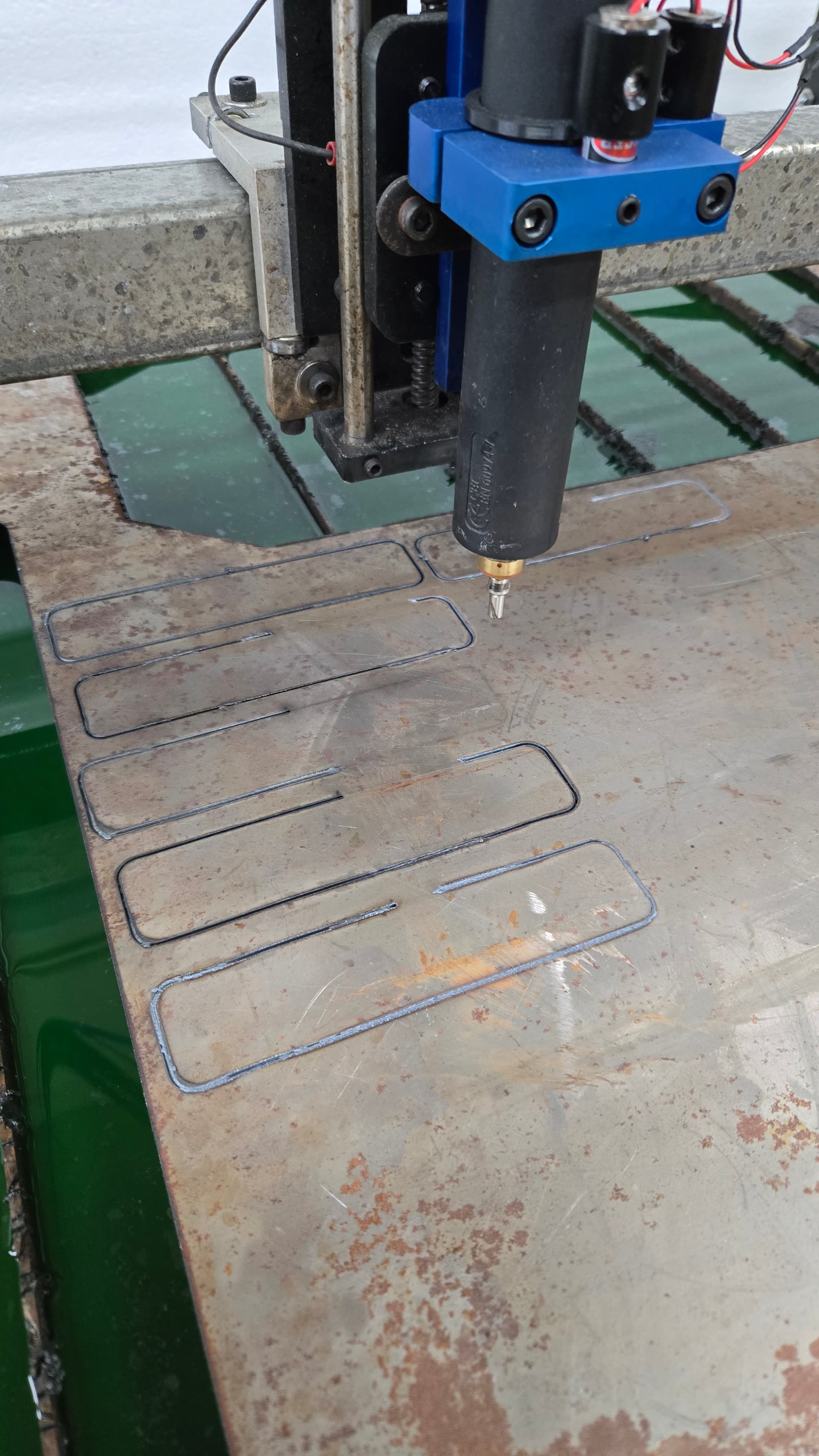 Work clamp on my mag holder (behind the gantry in the first picture, but directly on the work), 20a, 60psi, 220ipm (slowed it down to 160 ipm even), .125 pierce height, .5s pierce delay (tried to drop it to -20% to no avail thru firecontrol). I tried to drop the PSI down but the solenoid didn’t seem to like anything below 50 on the everlast by test firing the air through the front panel button. Also, it doesn’t seem to be cutting fully through the material when the arc does kick off.