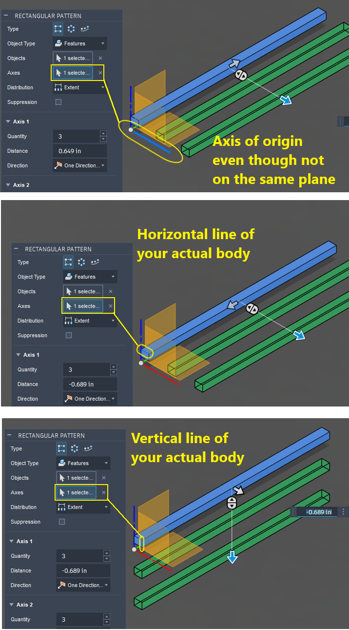 Keep in mind that in both examples I used, they will ask for your axes. This is where Fusion is very tolerant. It will allow you to pick any straight line in you sketch or on the body or any of the axes lines of the origin even when your sketch or body does not lie in the one of the planes of the origin. Fusion will even allow you to pick construction lines.