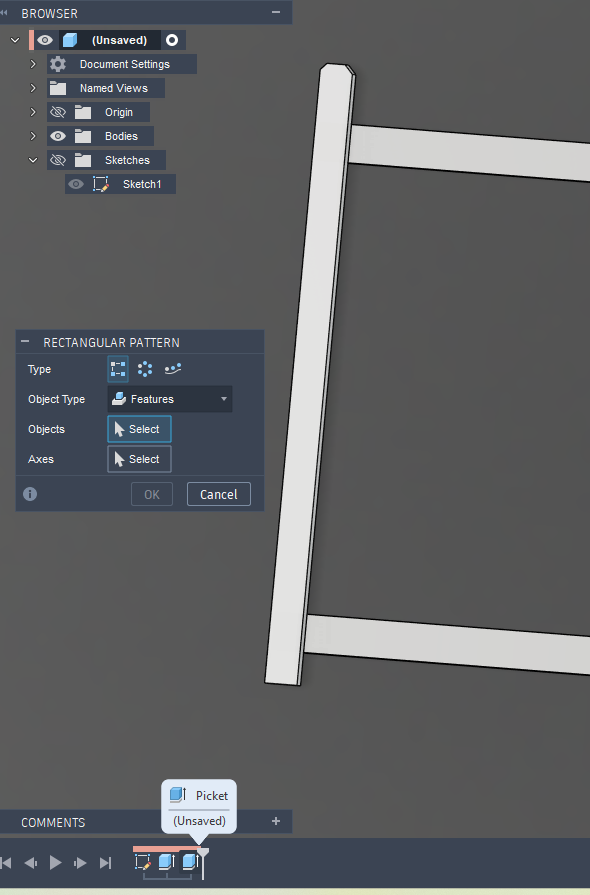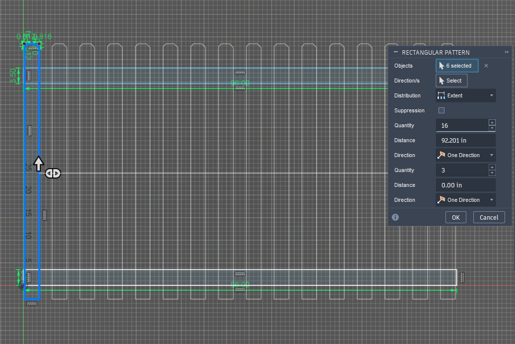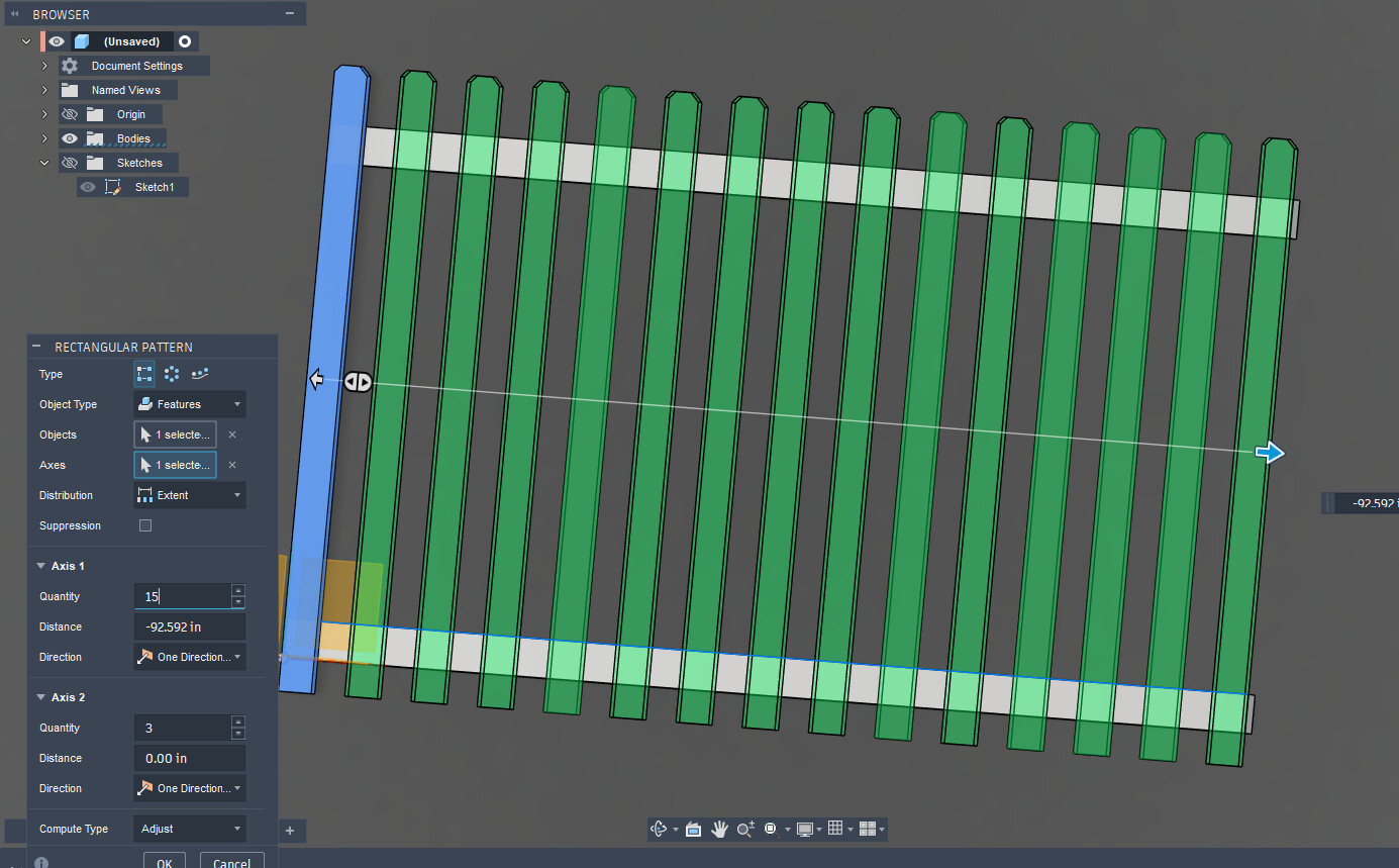 Does anyone have a quick way to lay out pickets in fusion 360? I like to create 3d models of my jobs for shop drawings. I have not found an efficient way to set pickets spacing quickly. Currently I am manually dimensioning each picket which is very slow. Sometimes I will set a center point and mirror them but its not always super quick. I also sometimes pattern on path after its all extruded but that seems wonky sometimes too. Any help is greaty appreciated!