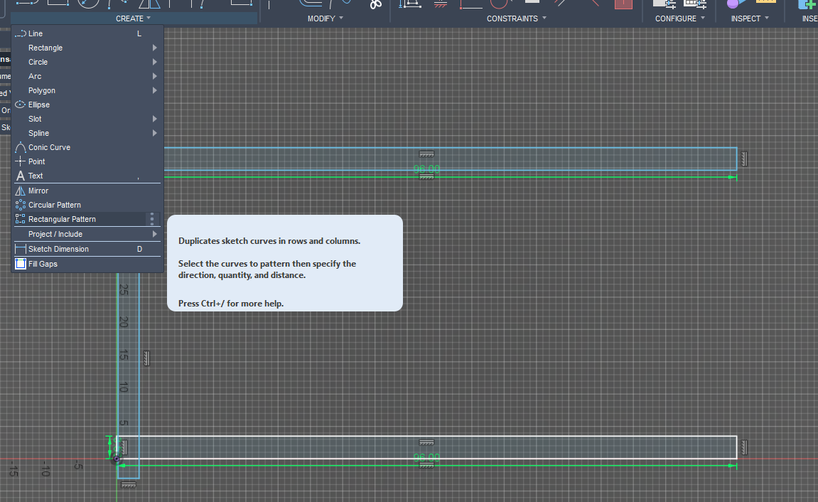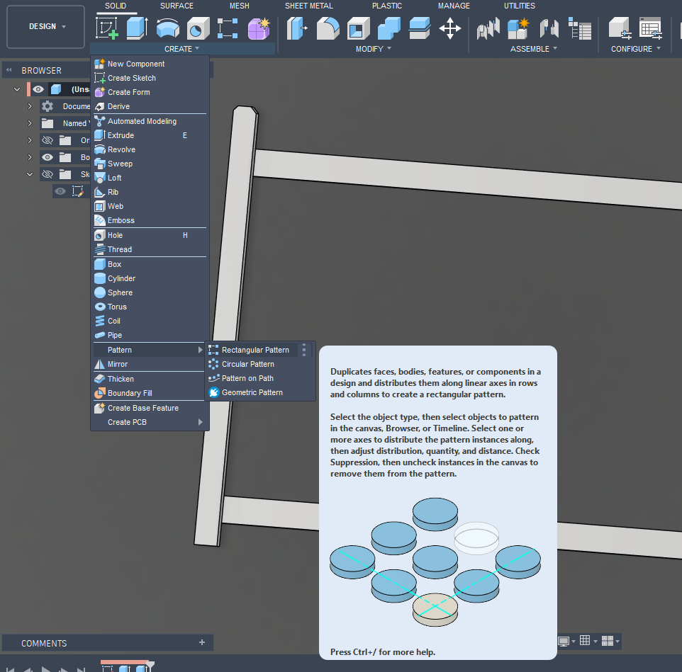 Pick “Rectangular Pattern”. Double click or hold down shift while selecting multiple items: