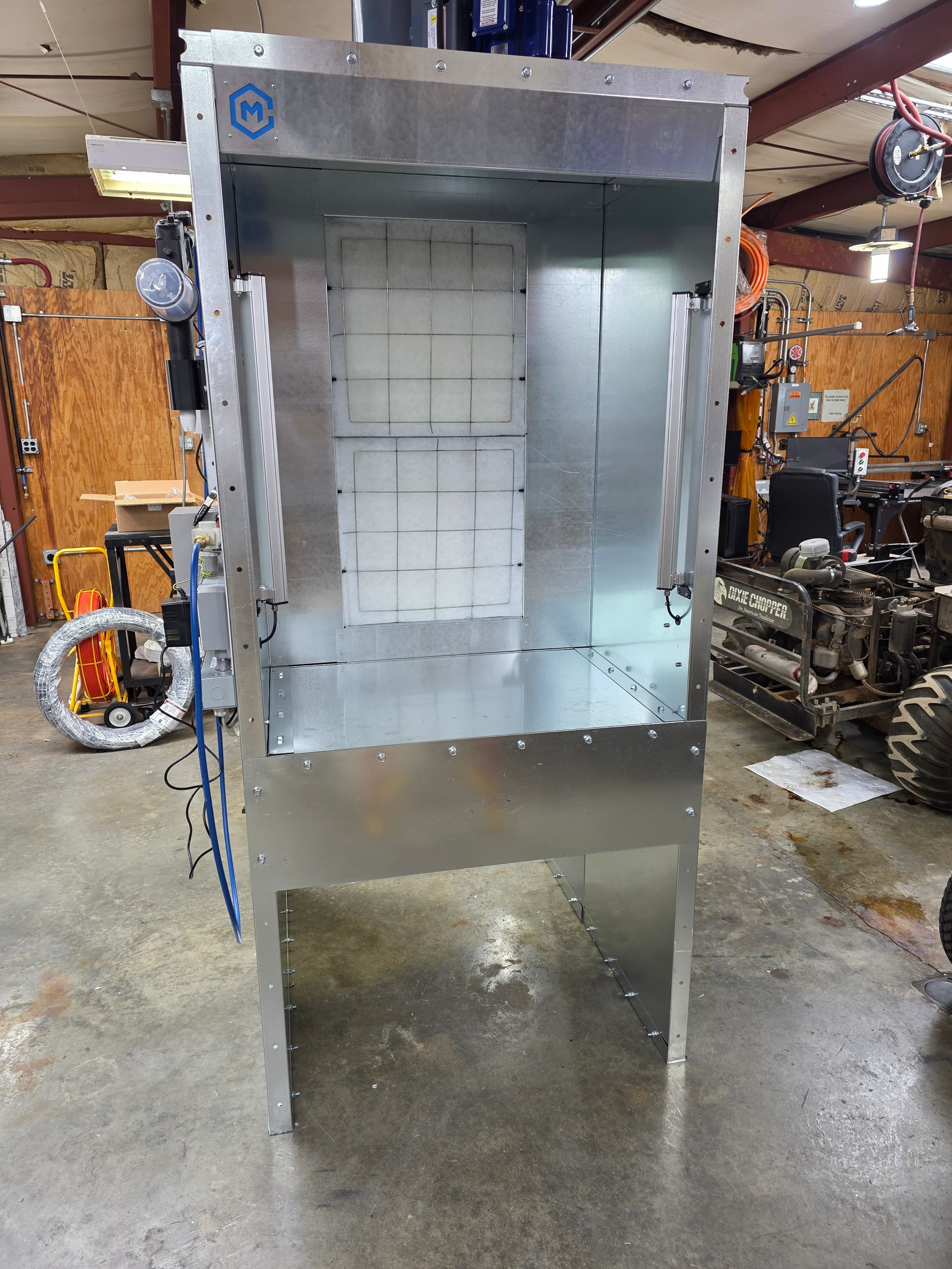 The Lights are from Amazon, and the exhaust goes out through the roof. The filters are from Cook Manufacturing. I wired the unit myself with a magnetic motor controller.