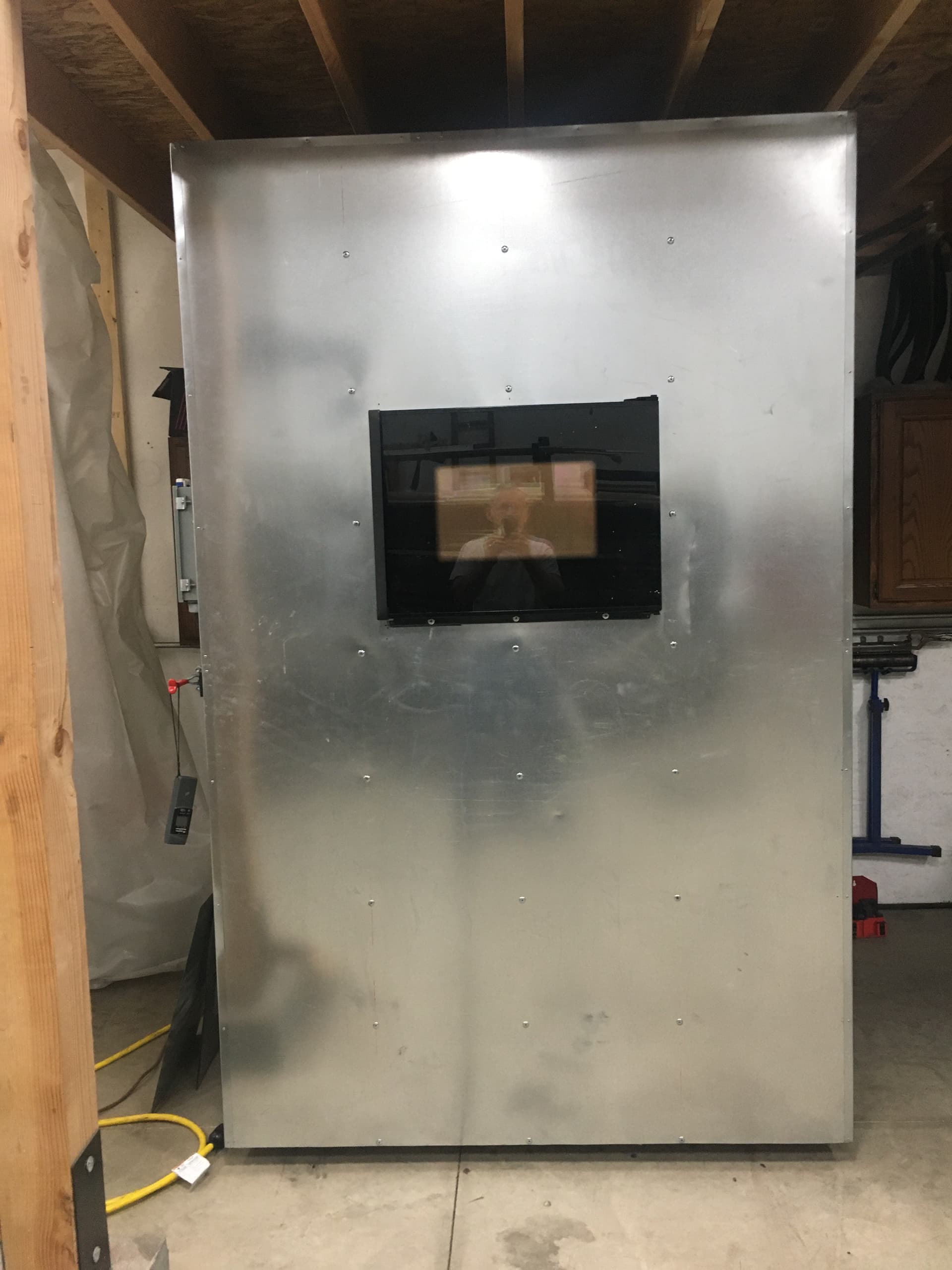 Booth expands to 10x10x10, the pic shows it expanded to just 5 feet. It uses a old furnace squirrel cage fan and blows outside. it works pretty well.