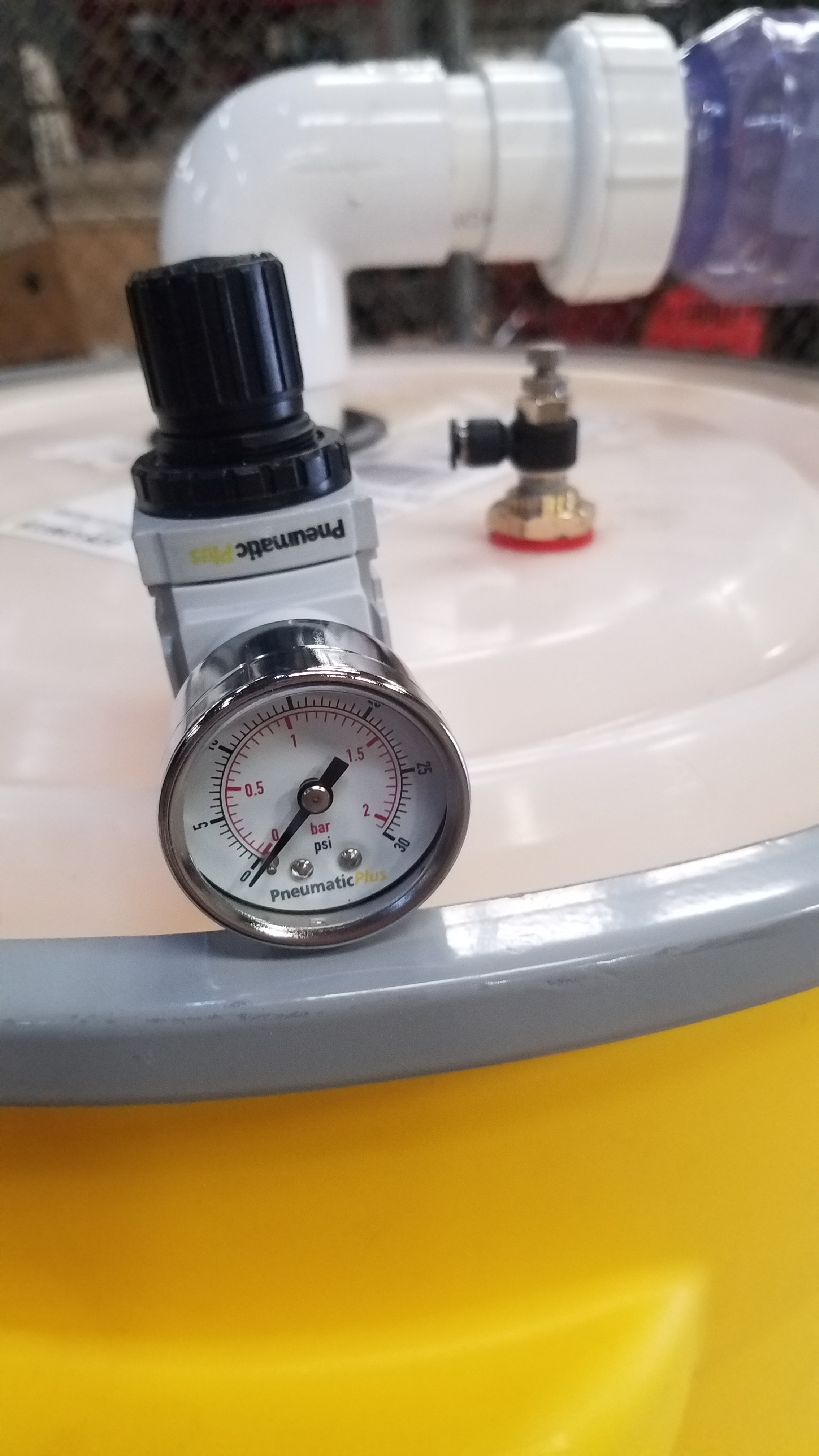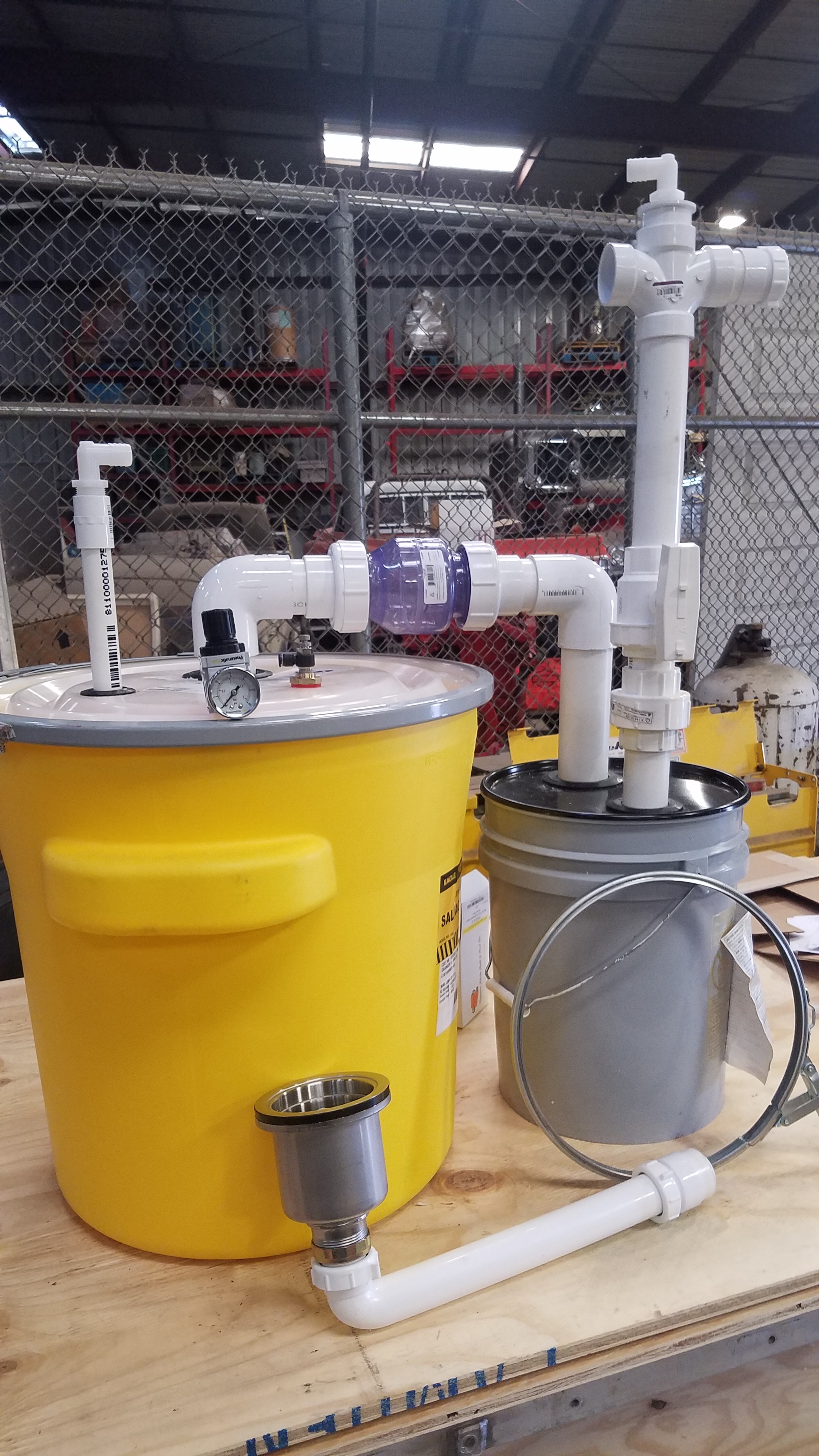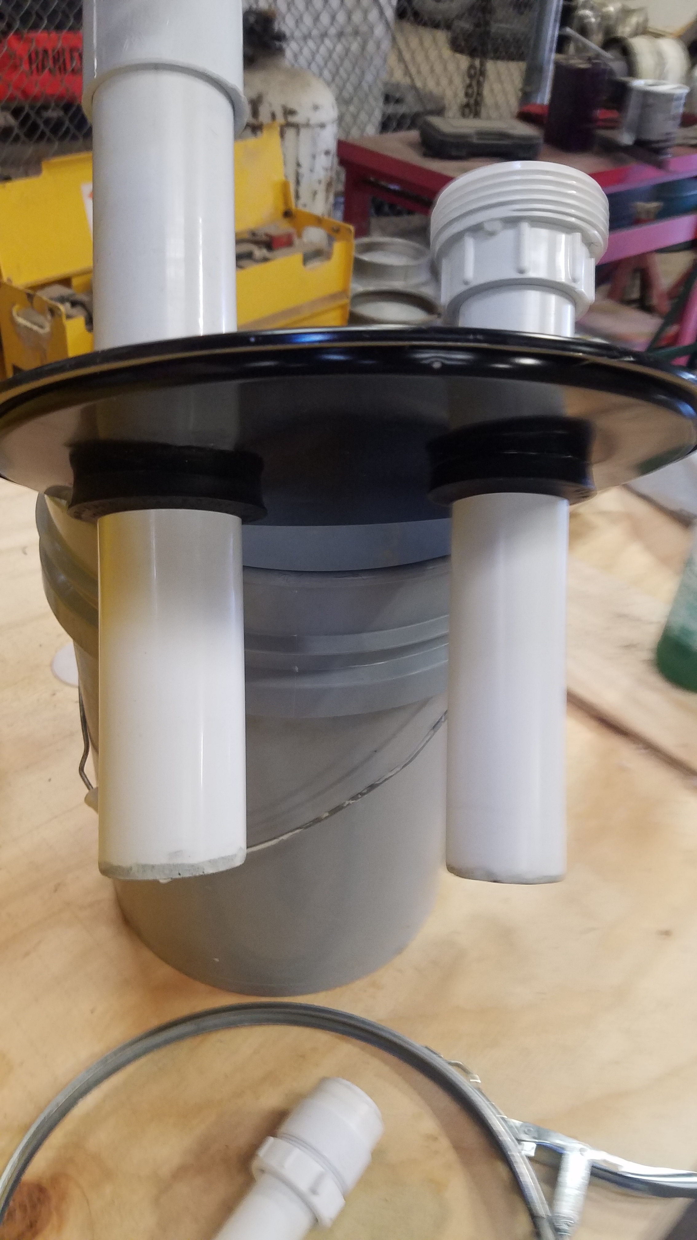 My take on water management. 5gal bucket will catch metal that doesn’t get caught by sink drain basket. One way flapper valve will close when a couple of pounds of air is applied to fluid in yellow barrel. Using low pressure regulator 0-30psi and adjustable orffice to keep from shocking tank with initial pressure. Easy disconnect unions to allow 5gal bucket to be dump or replaced. Steel clamp to hold lid on the bucket. Height and drain pipes will need shortening once table is together.