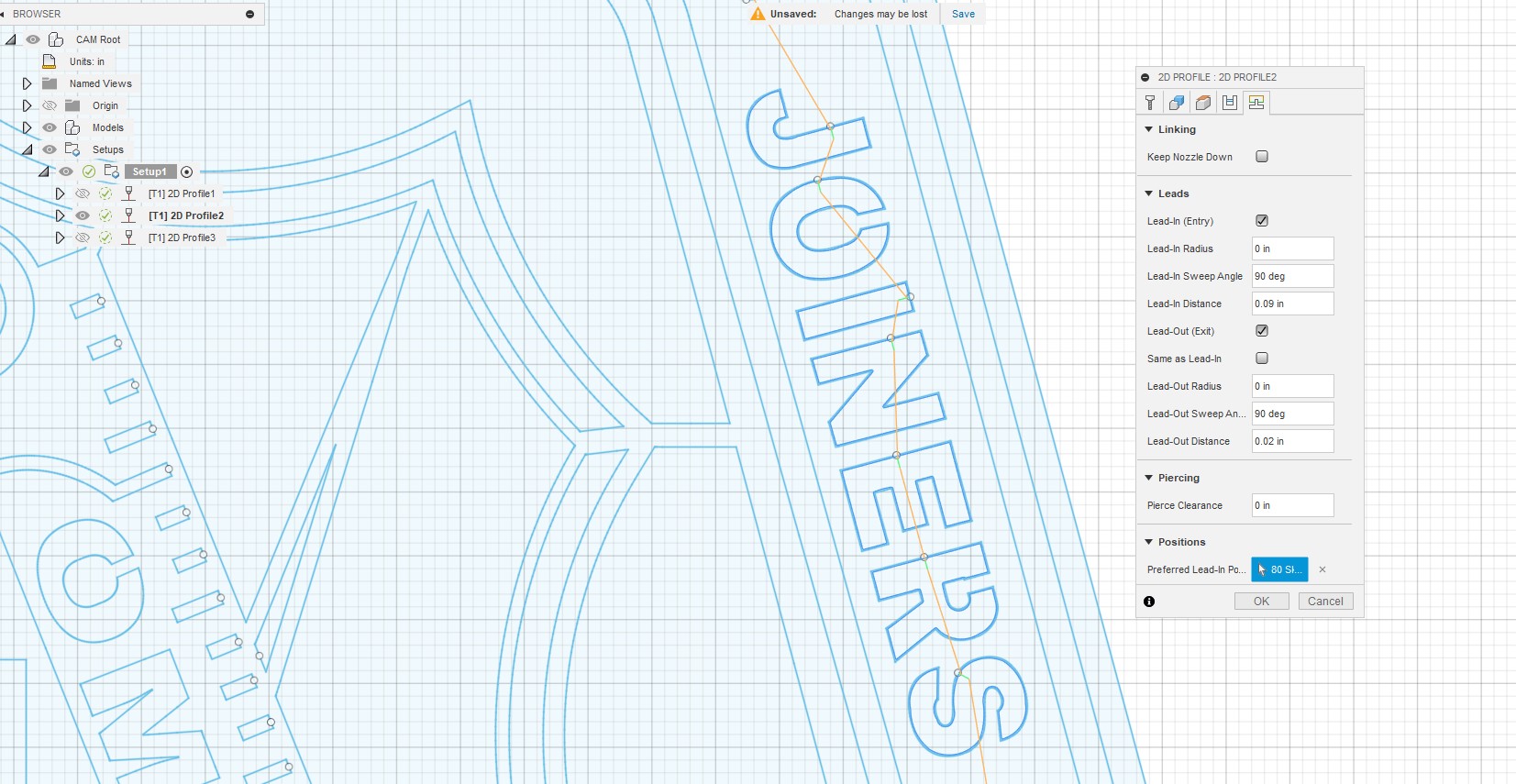 I’m a little late to the party but for my “art projects” I use zero kerf and do not use lead ins or lead outs. This cut is part of a helicopter tail rotor. 0.0641" separation between the points in the drawing.
