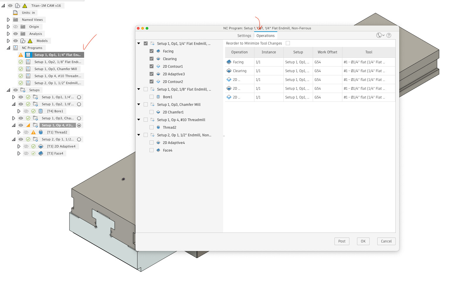 Don’t make a separate setup for each operation unless you need a tool change. One setup can have as many operations as you require. For example one setup could cover facing, bore, 2d adaptive and contour. As long as the part position stays the same in the vice and no tool changes are required.