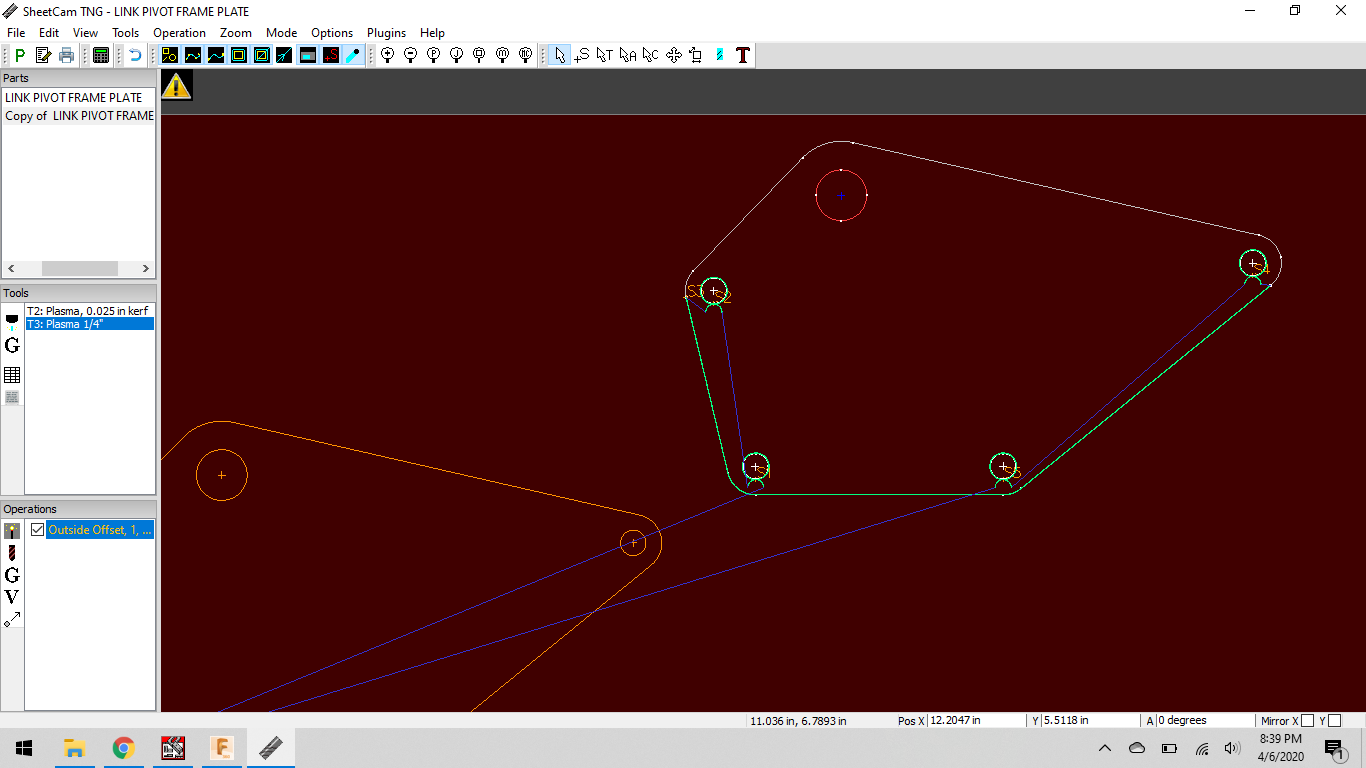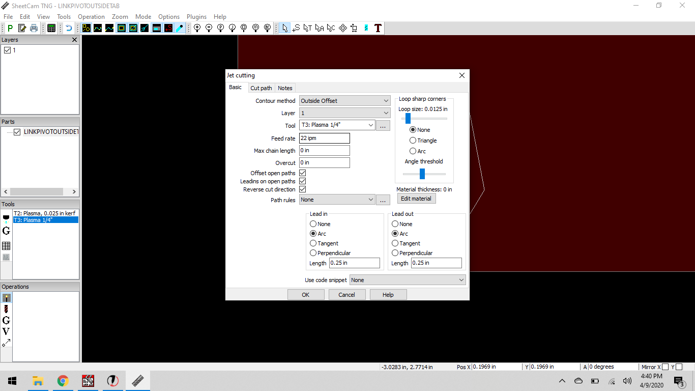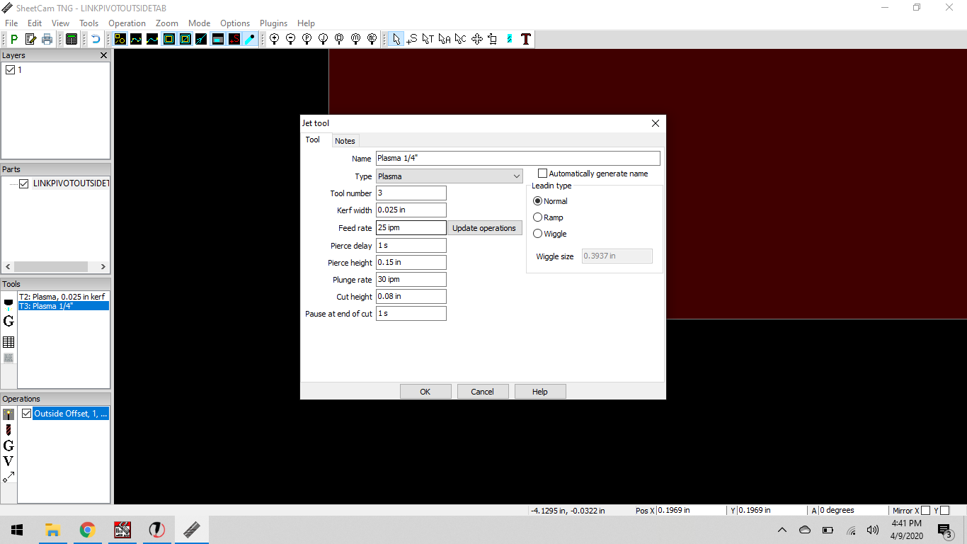well, im having more issues with sheetcam again. it doesnt recognize the part as is, and keeps thinking the outside is inside or something, the hole keeps getting a lead in from the metal side and wont add a lead in for the outside