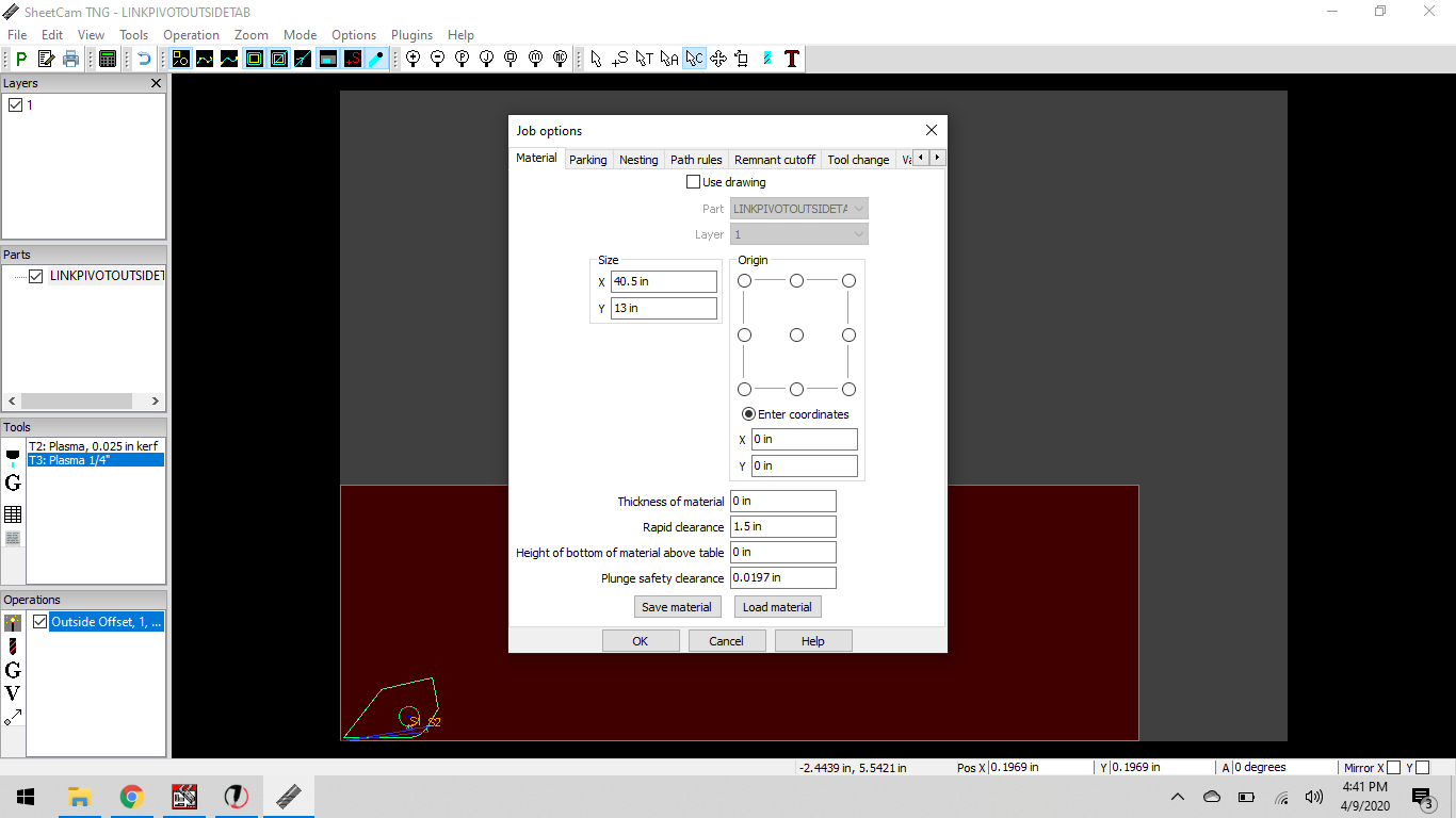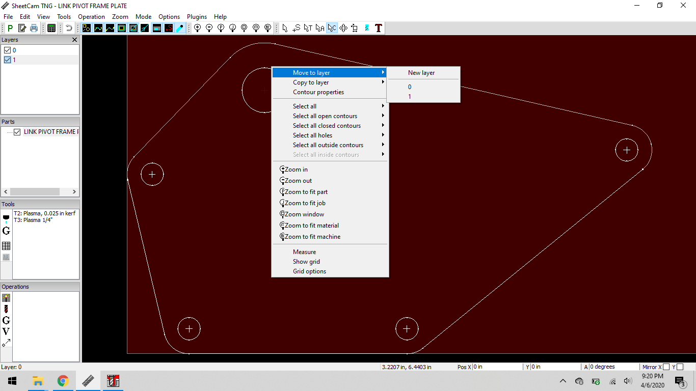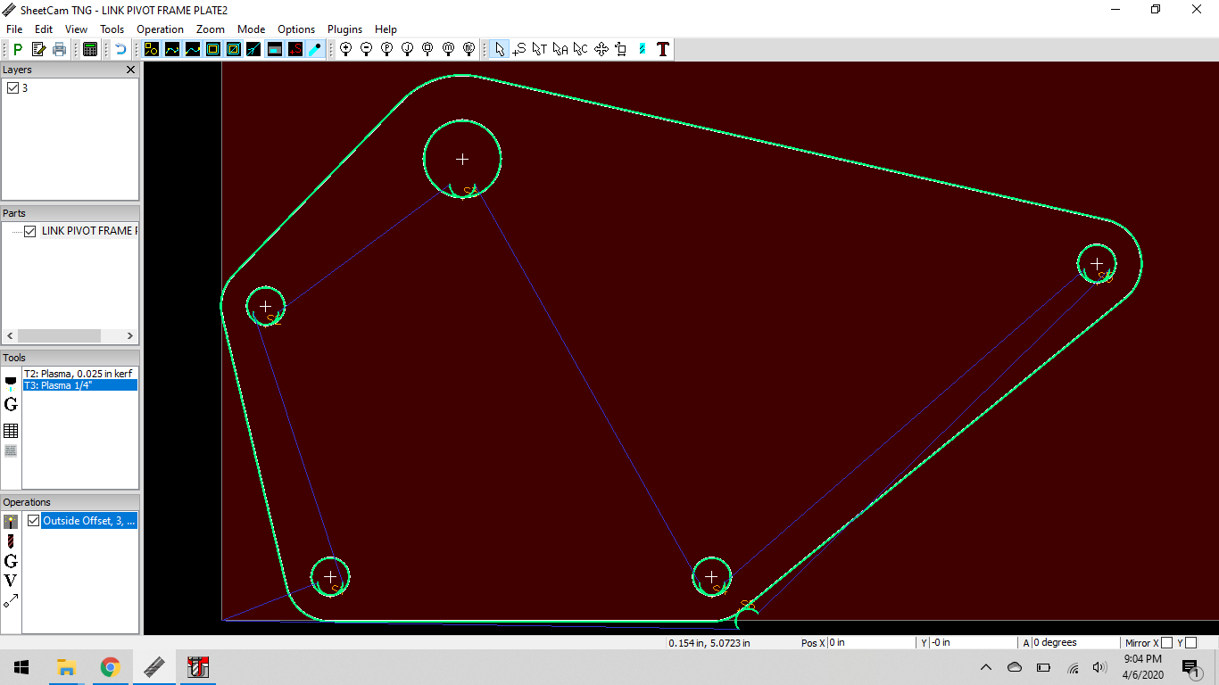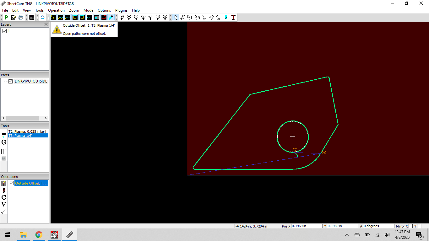 well, im having more issues with sheetcam again. it doesnt recognize the part as is, and keeps thinking the outside is inside or something, the hole keeps getting a lead in from the metal side and wont add a lead in for the outside