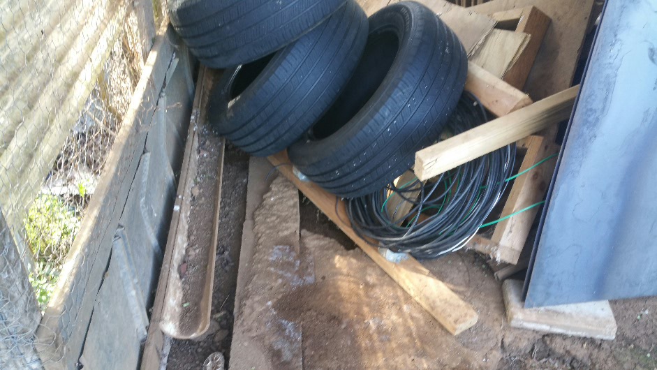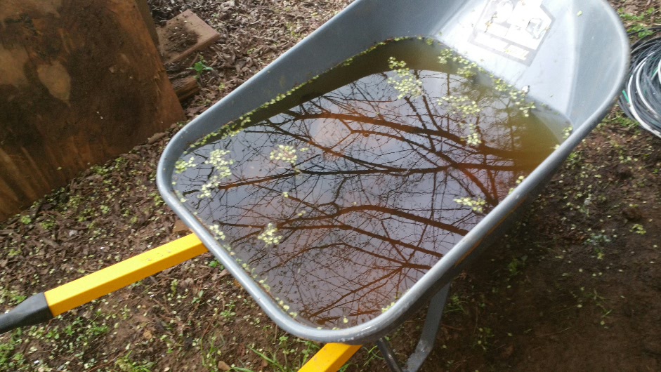 Well it is next installment time, hell of a storm Sunday night, lots of flooding etc…this is the wheelbarrow I was using all day Sunday…it was full,empty,full, empty…not a swiming pool for frogs.