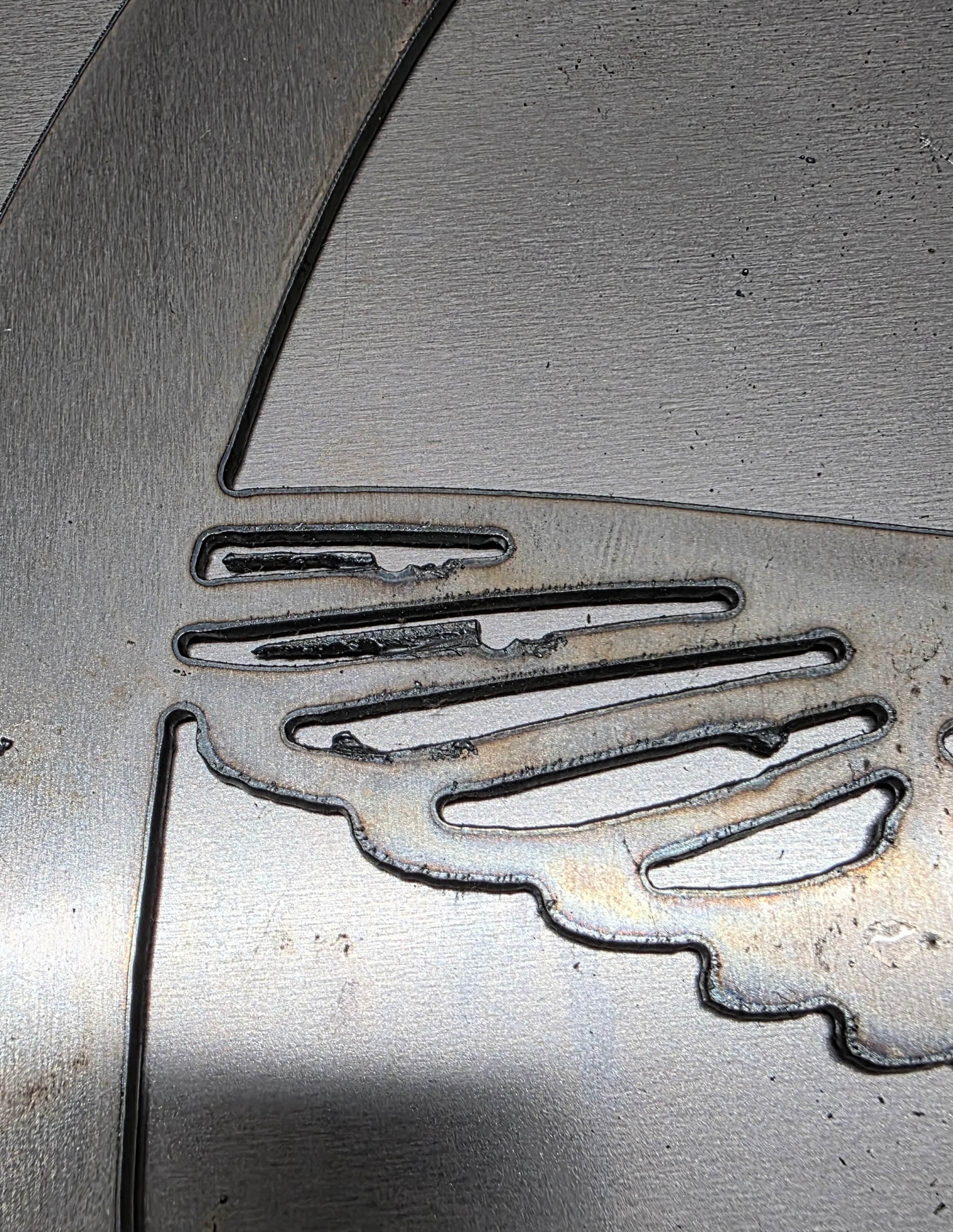 After cutting this 18” round sign with a hummingbird, I still have this issue. I finalized this sign months ago and just got around to cutting this evening. I have no idea what the parameters were. That aside, if I am cutting 14 gauge steel, what are some of the settings you guys/gals are using for cuts that don’t hang on? I also noticed the initial burn through semi-circle, is there another setting for lead-in on these areas?