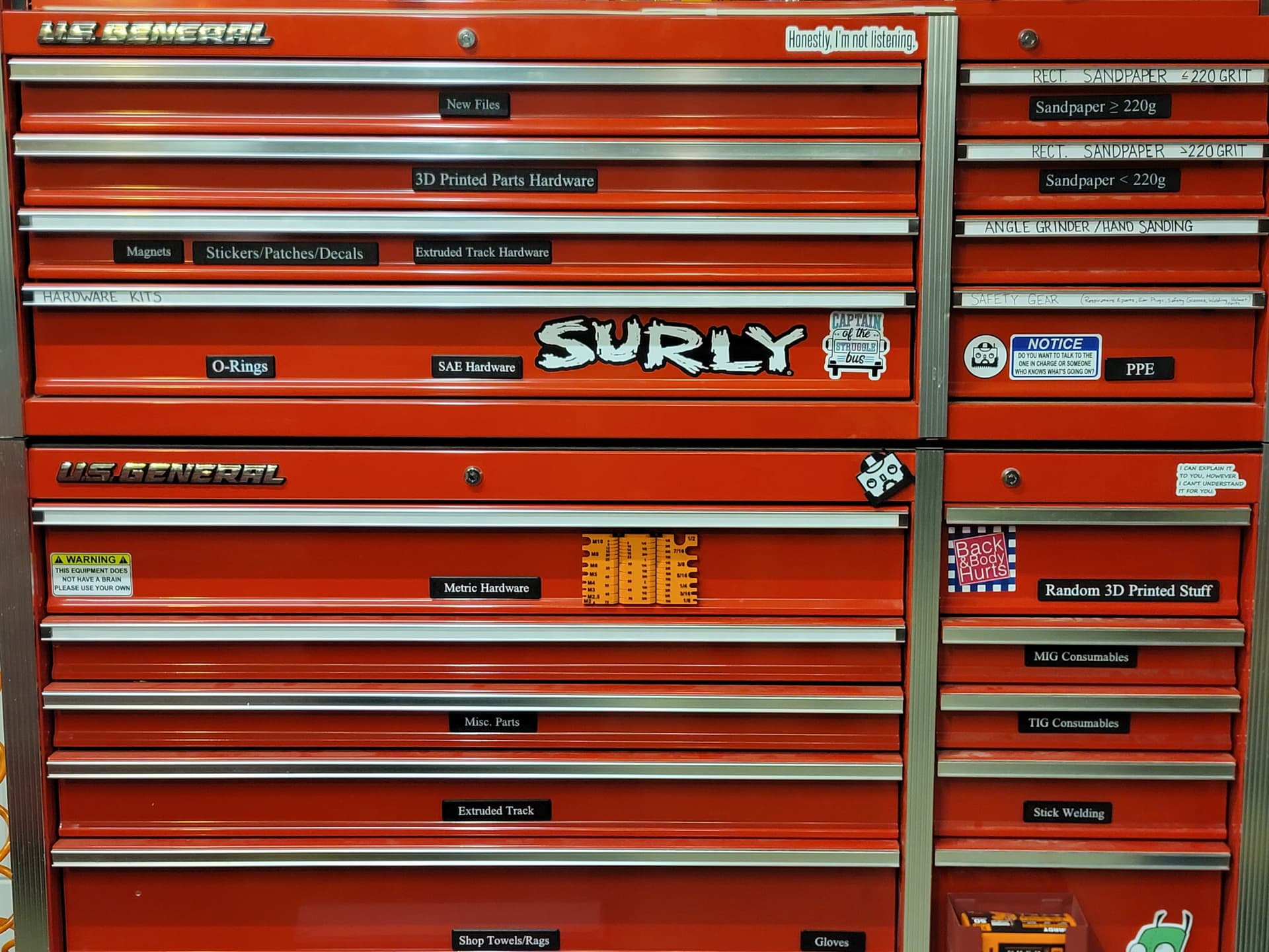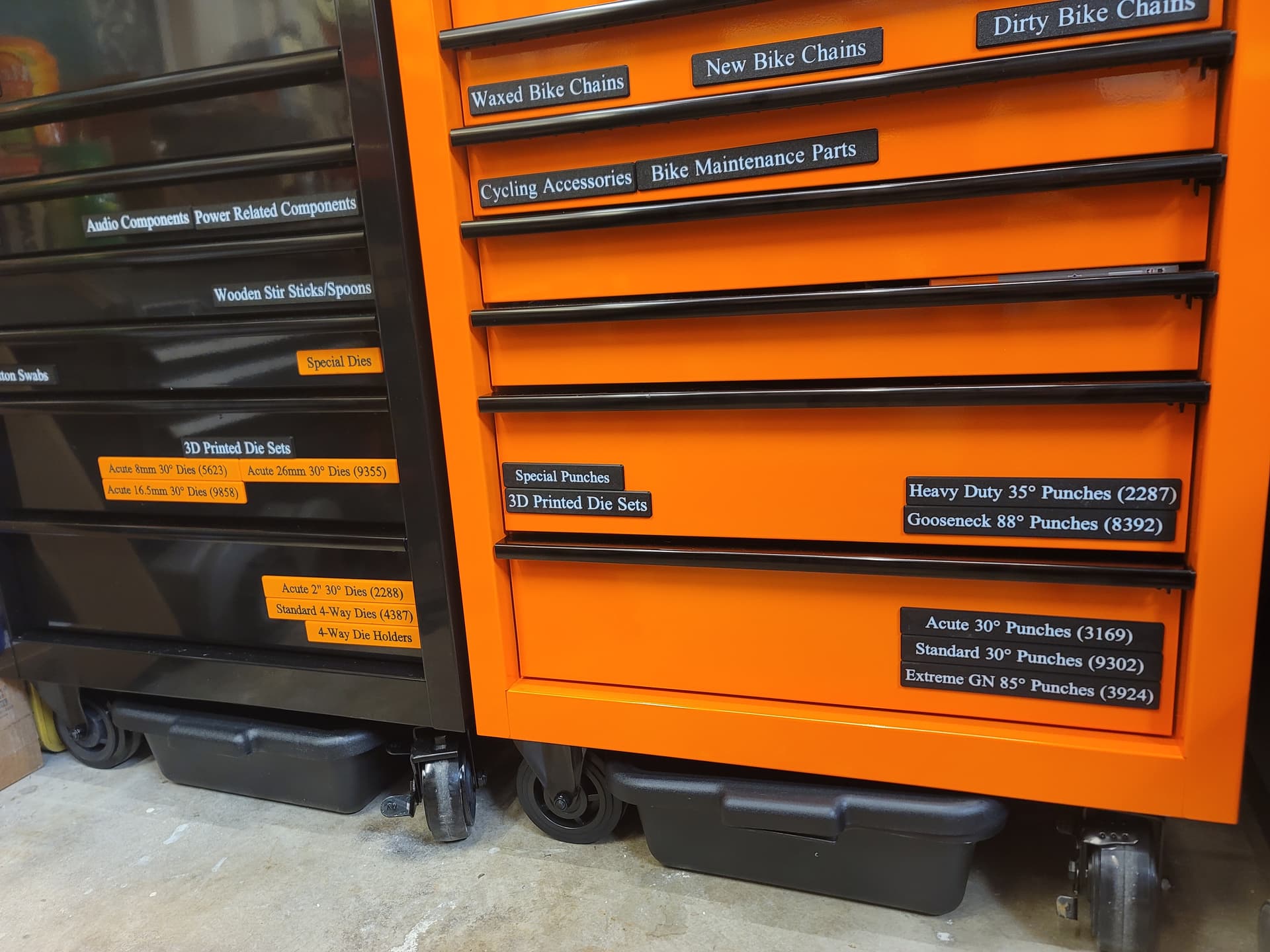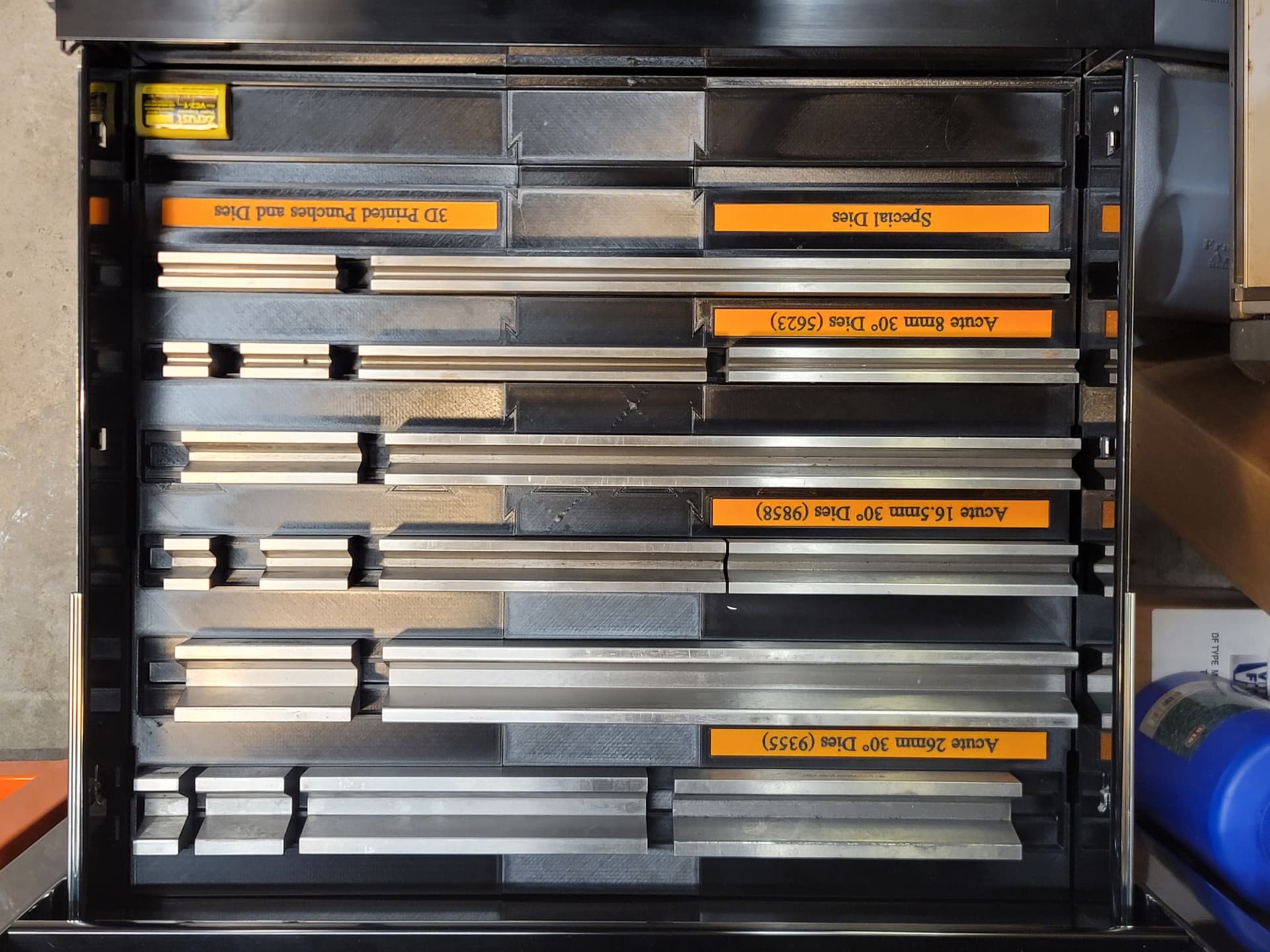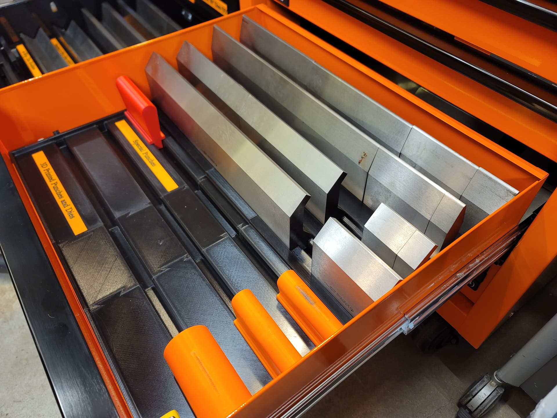 Finally got around to sorting out a storage solution for all my punches and dies thanks to my 2 Bambu Lab X1 printers putting in some long hours with 8 or so rolls of Elegoo Rapid PETG, and a couple new US General 22" rolling tool chests. I had intended to form and weld up my own super ridiculously over built rolling tool chest, but once I calculated the cost to build my own chest of drawers, the load per drawer if I organized the dies into these tooling chests, the extra storage it would afford me that would allow me to get rid of a large work desk, and the need for every single extra square inch of floor space, it didn’t make sense to spend my time competing with the Chinese when it comes to building tool chests, especially with the recent 20% off sale.