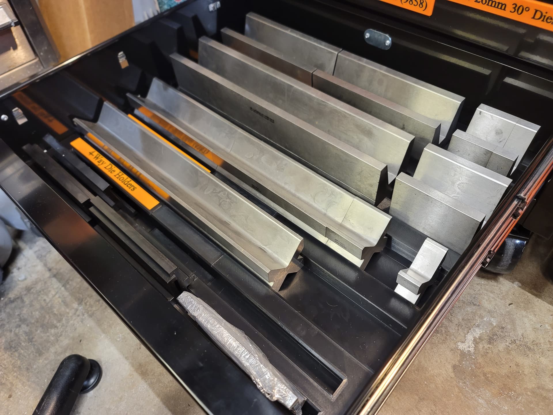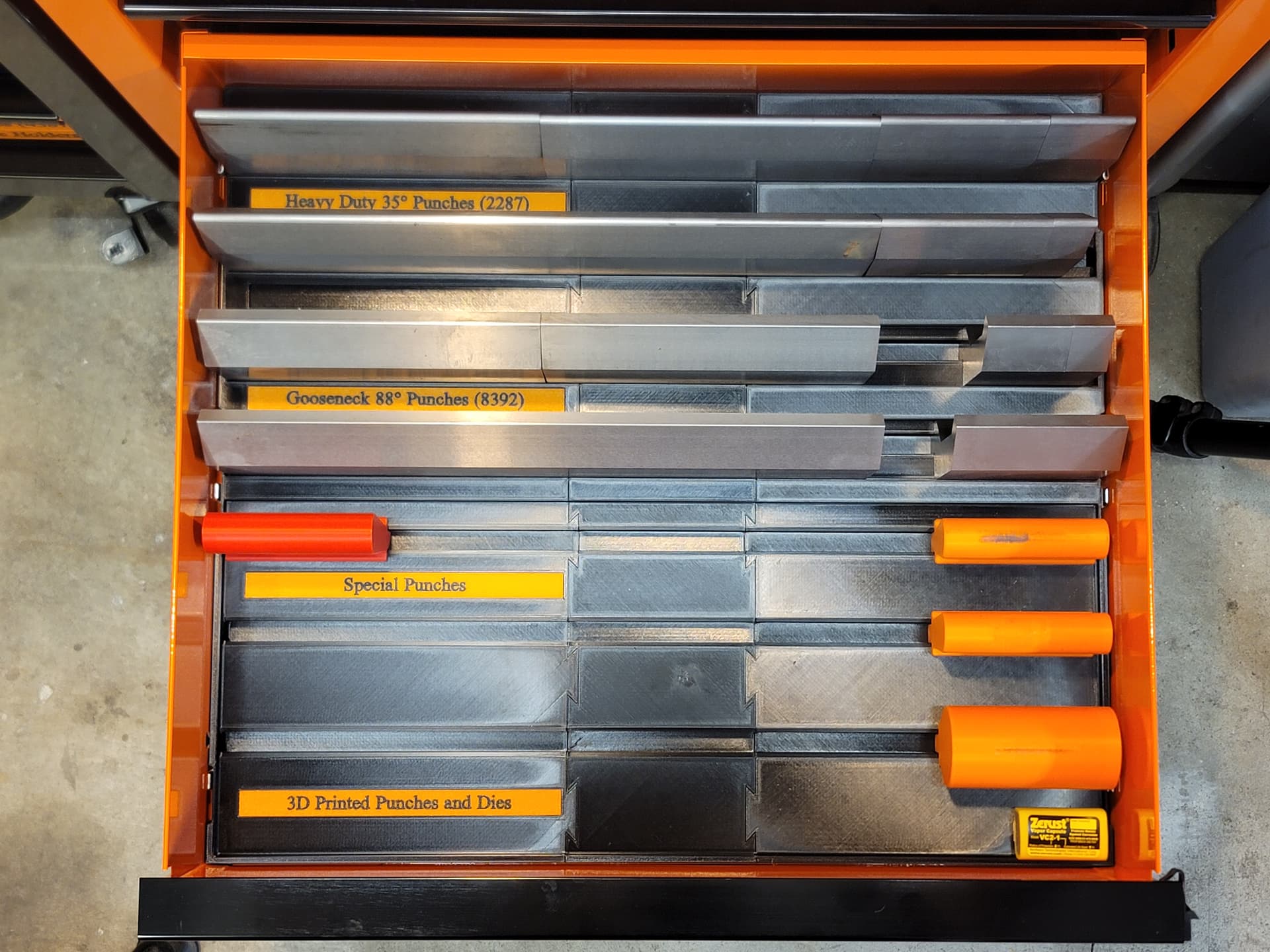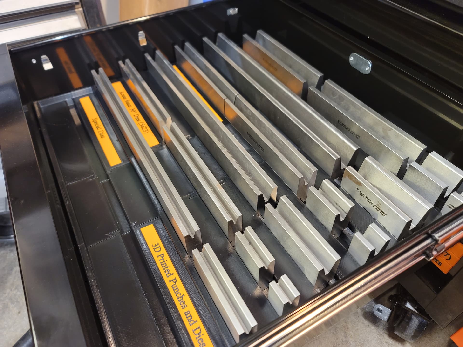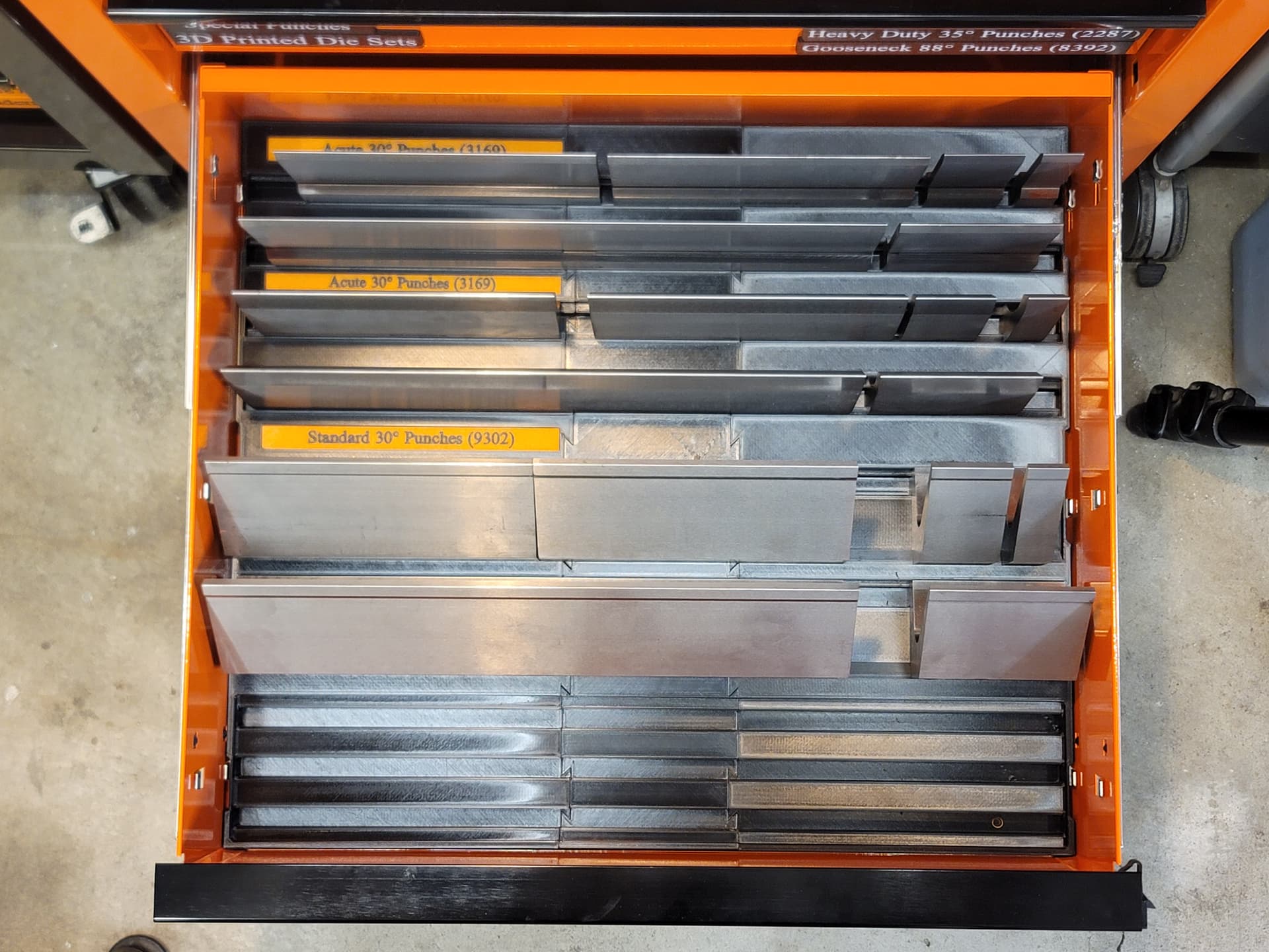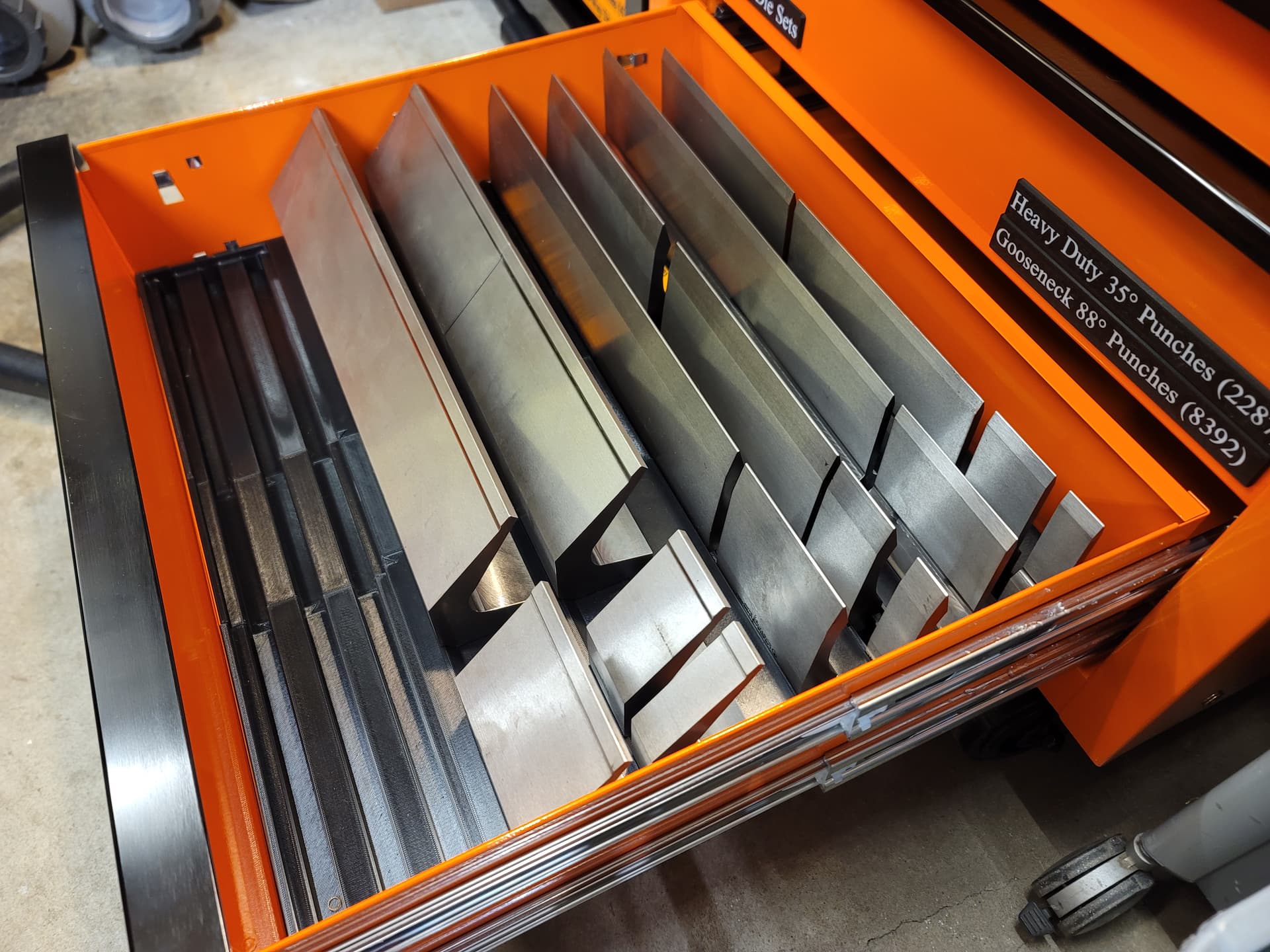 I ended up redesigning the drawers to dial in the weight per drawer better once I had a chance to test the drawer fully loaded. With the qty of punches I had loaded in the drawer I didn’t like how draggy it felt. Moving the 88° gooseneck punches to the drawer above with the HD punches and shifting the 85° extreme gooseneck dies back in the drawer balanced the weight much better. It wouldn’t probably be much of an issue, except I have 39" worth of each punch and die and that ends up too close to the 240lb weight capacity for the double slide drawers.